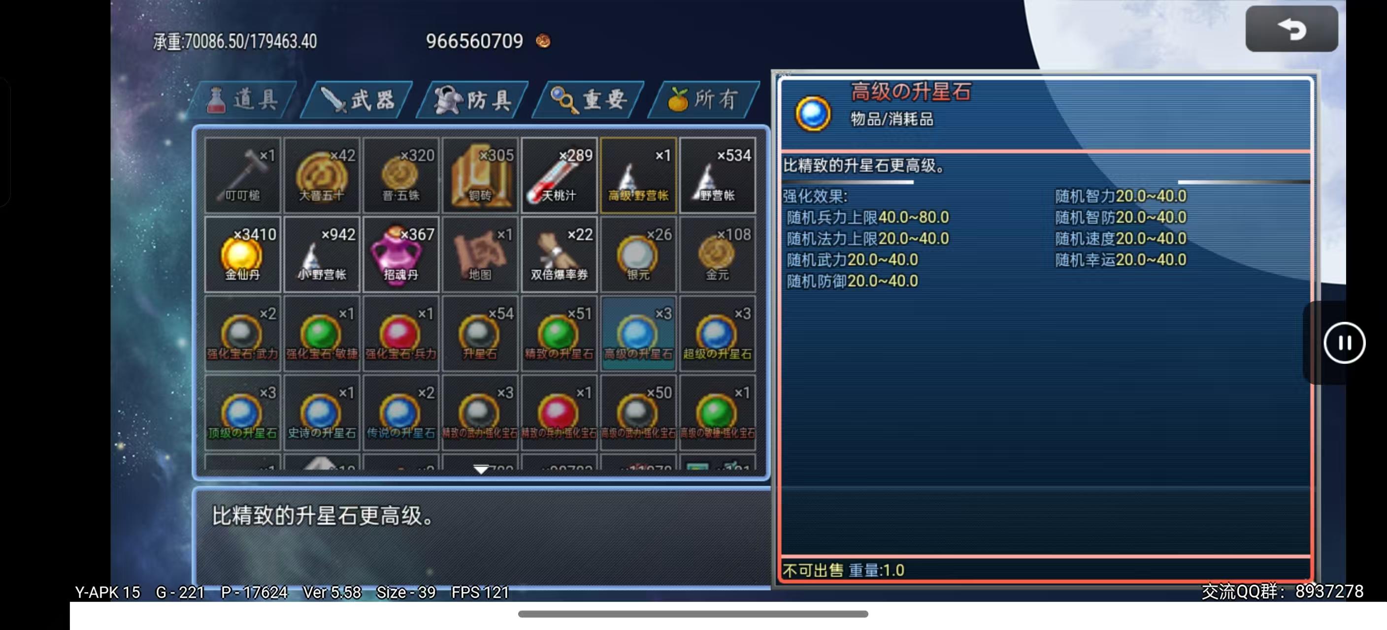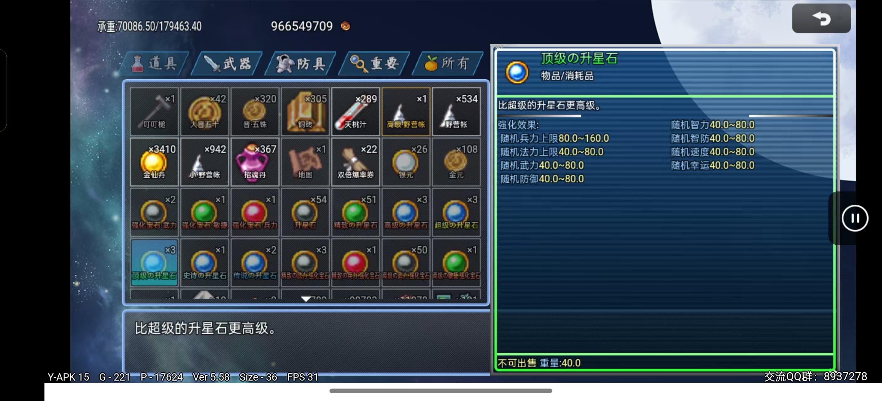 高级升星石随机加成兵力40-80,法力、武力、智力、防御、智防、速度、幸运20-40(可SL)