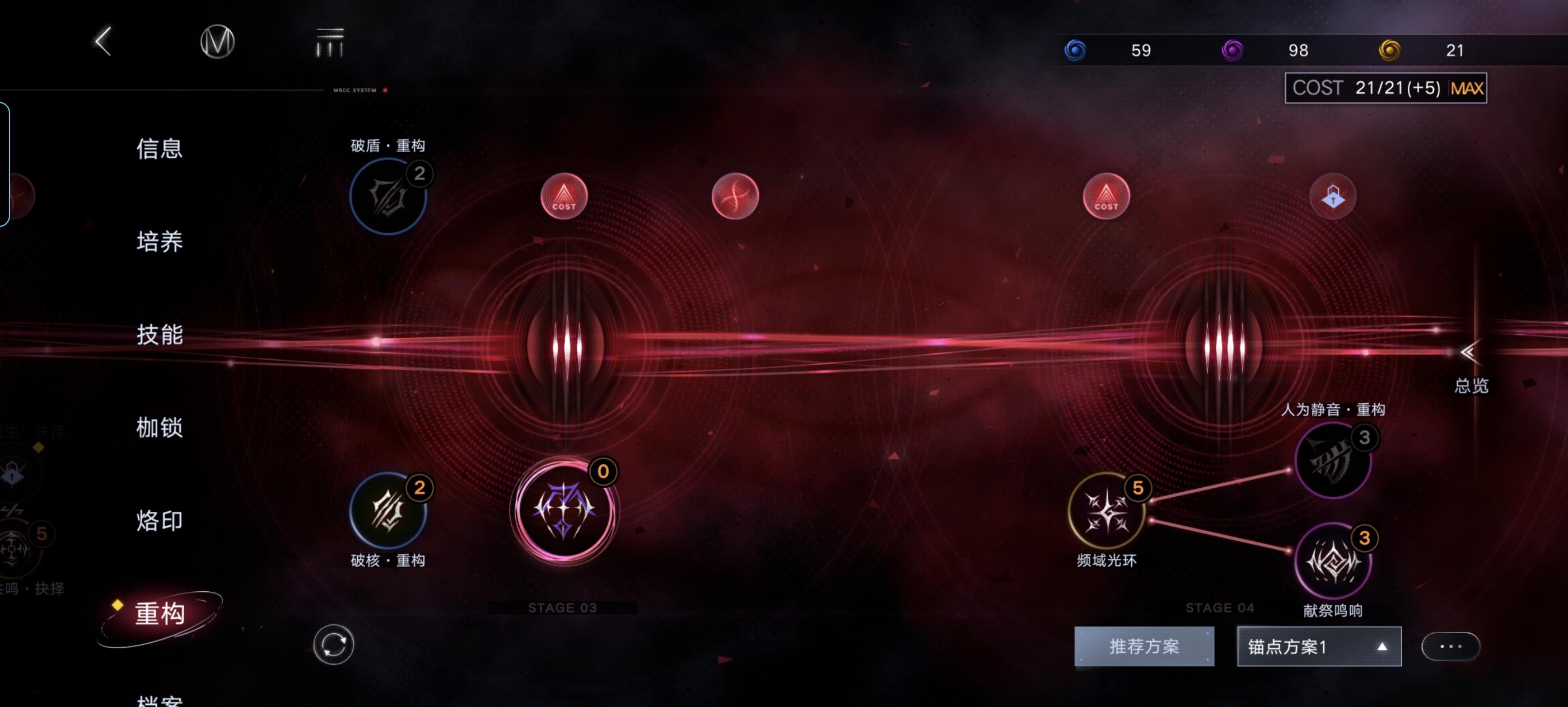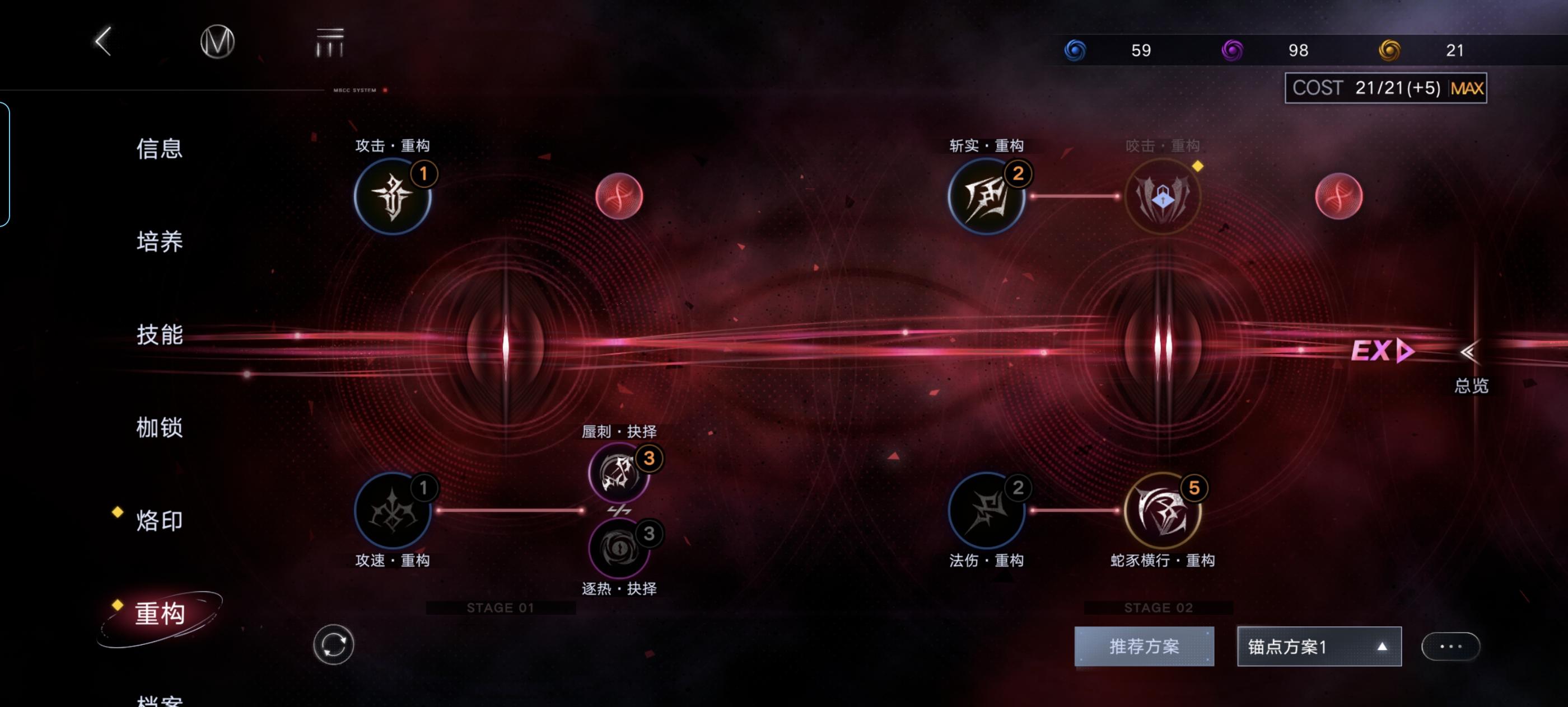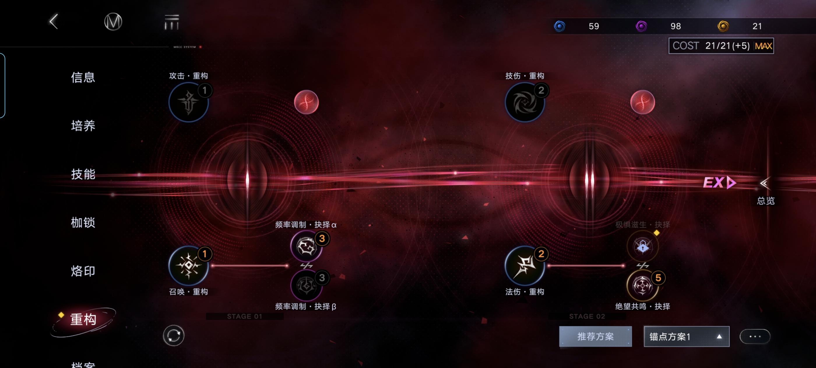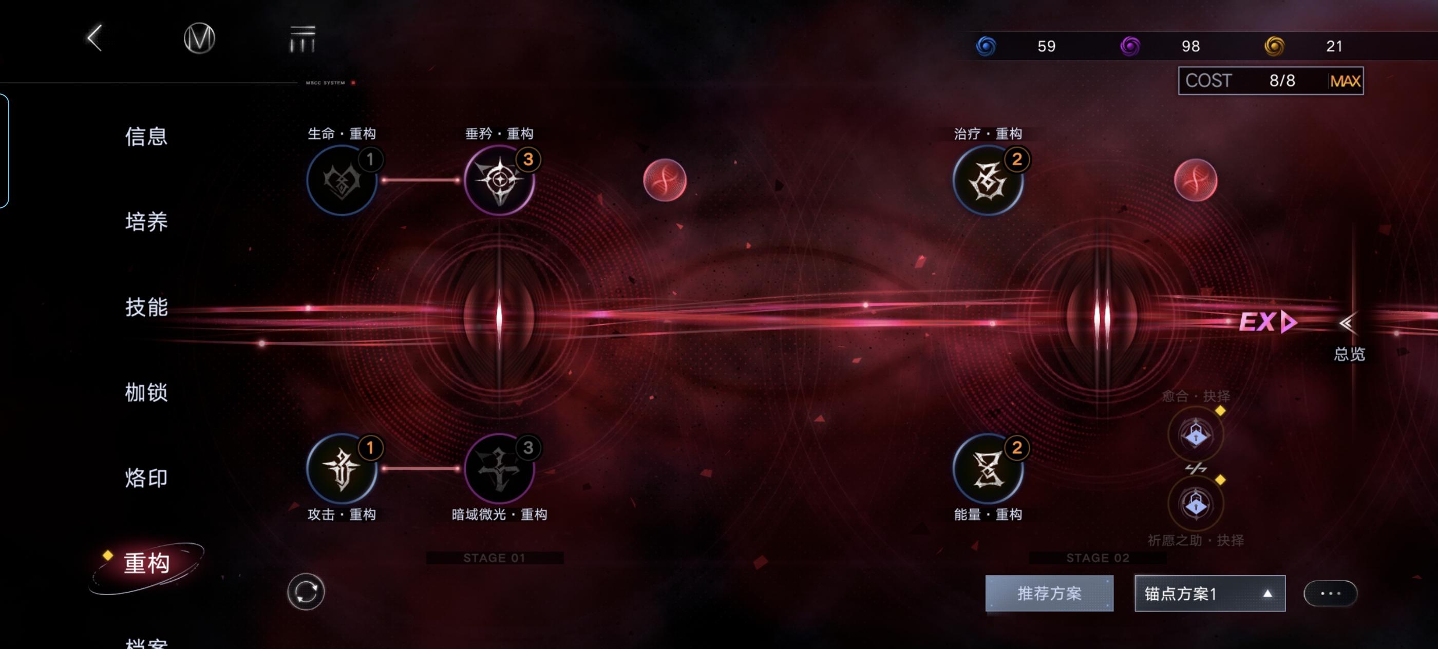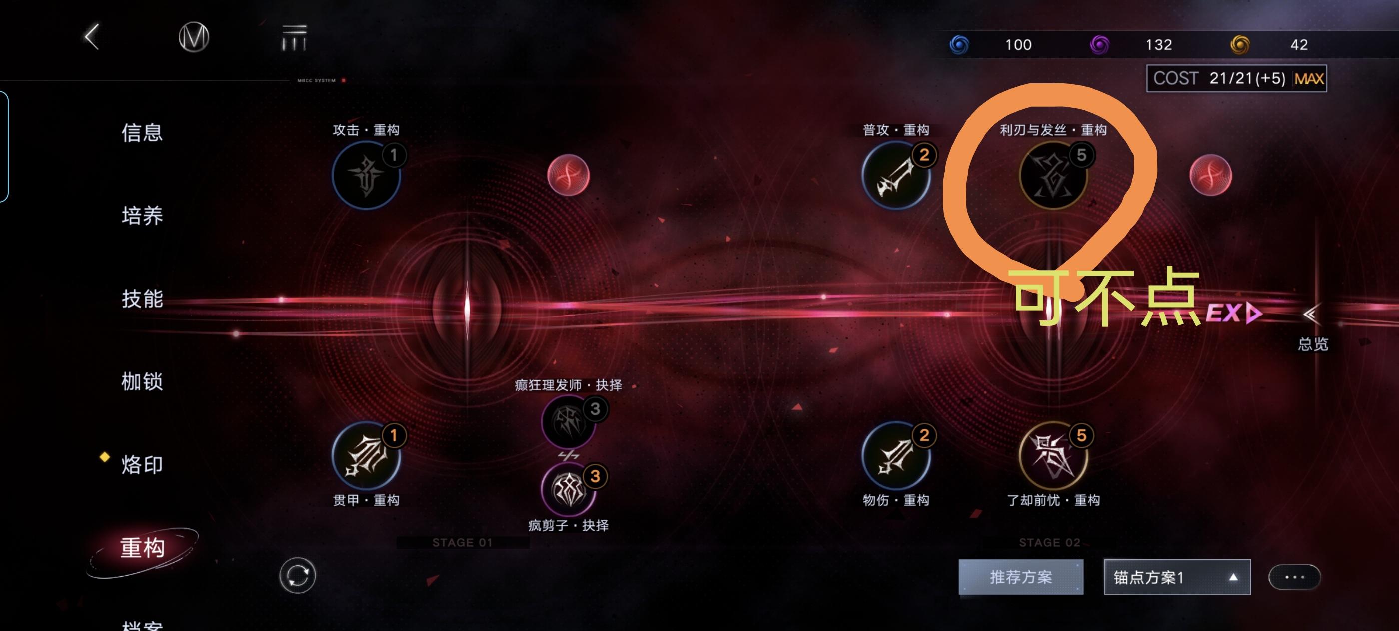 重构金豆是最稀缺的,紫豆蓝豆后期都会有大量富余,这两个节点全点就行。 萌新要注意,刚开始重构的时候要精打细算,间隙打满2-3期基本就能紫豆蓝豆自由了。