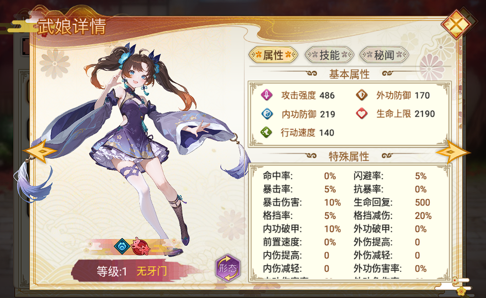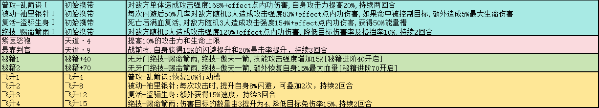 优秀领先的秘师基础速度,闪避回击和绝技有较强的清理aoe能力,秘笈提高角色续航能力,外加自身有复活能力和起身行动力有非常连续的输出能力;战斗局面上开局有极好的输出状态外加出手后闪避能力提升,是当下闪避组合的选卡,技能对敌人免伤和格挡进行削减,被动对自身行动有着极强的提速,对队友提速和少量闪避具有较强的联合效果,外加对被控制状态目标有输出提升,可以适配多组阵容。