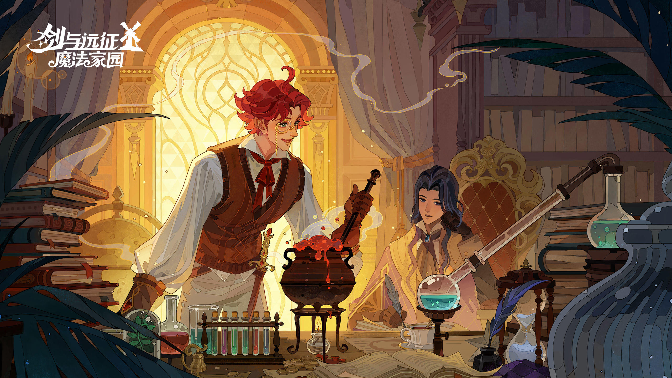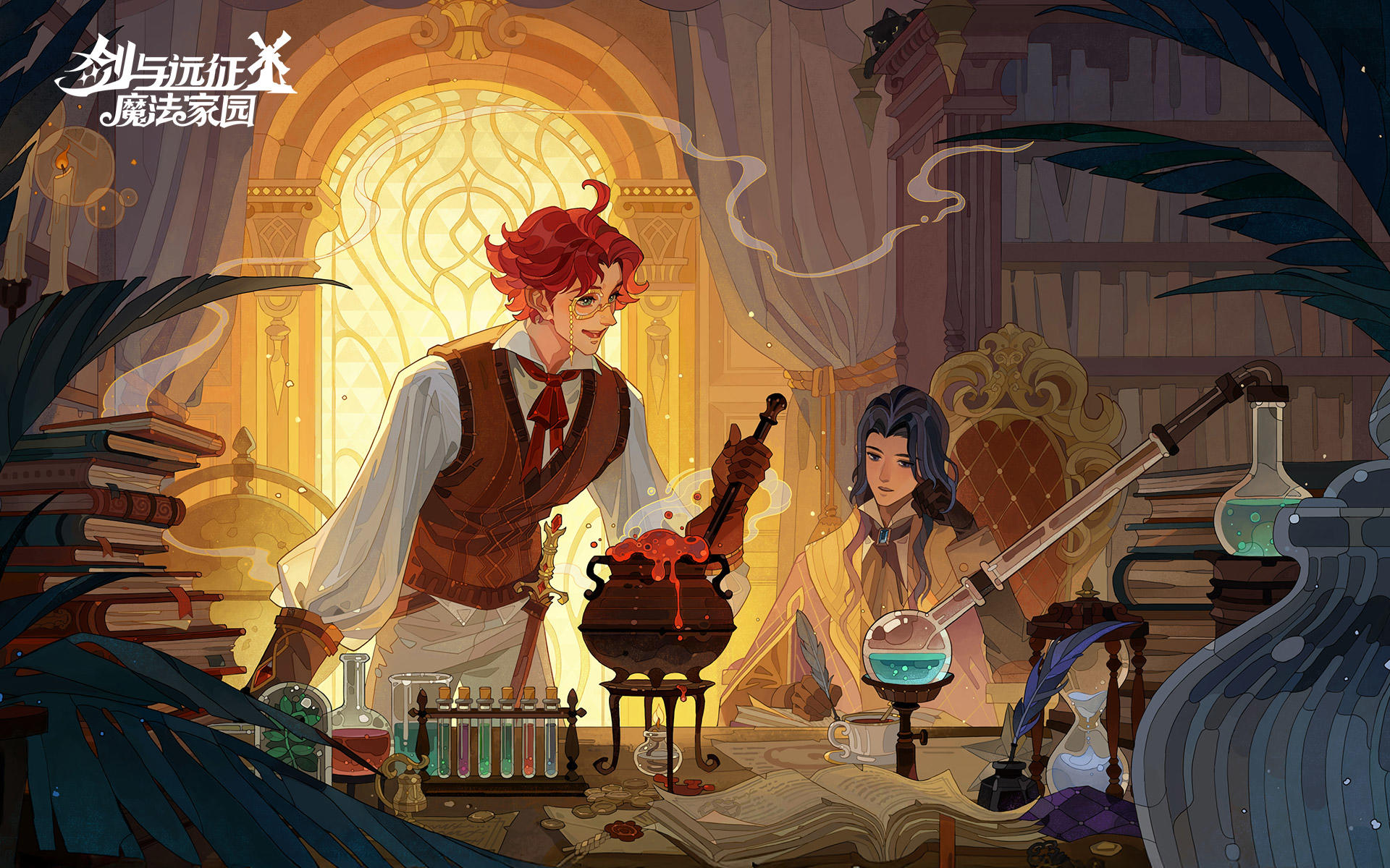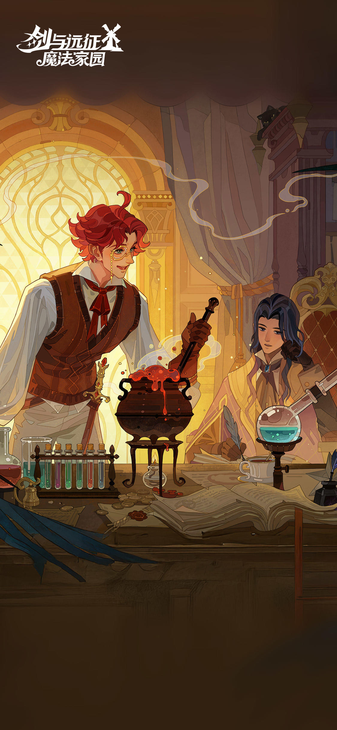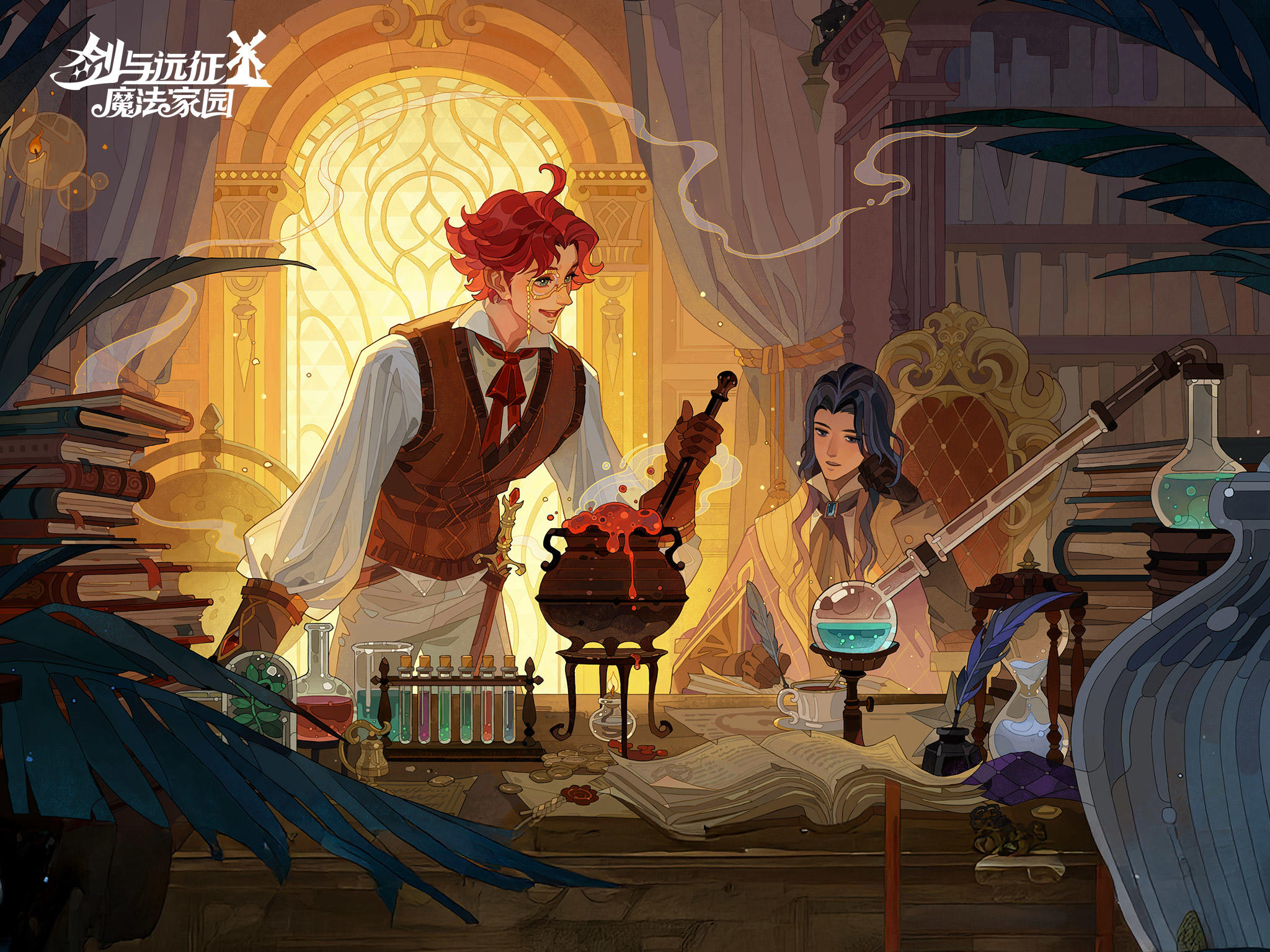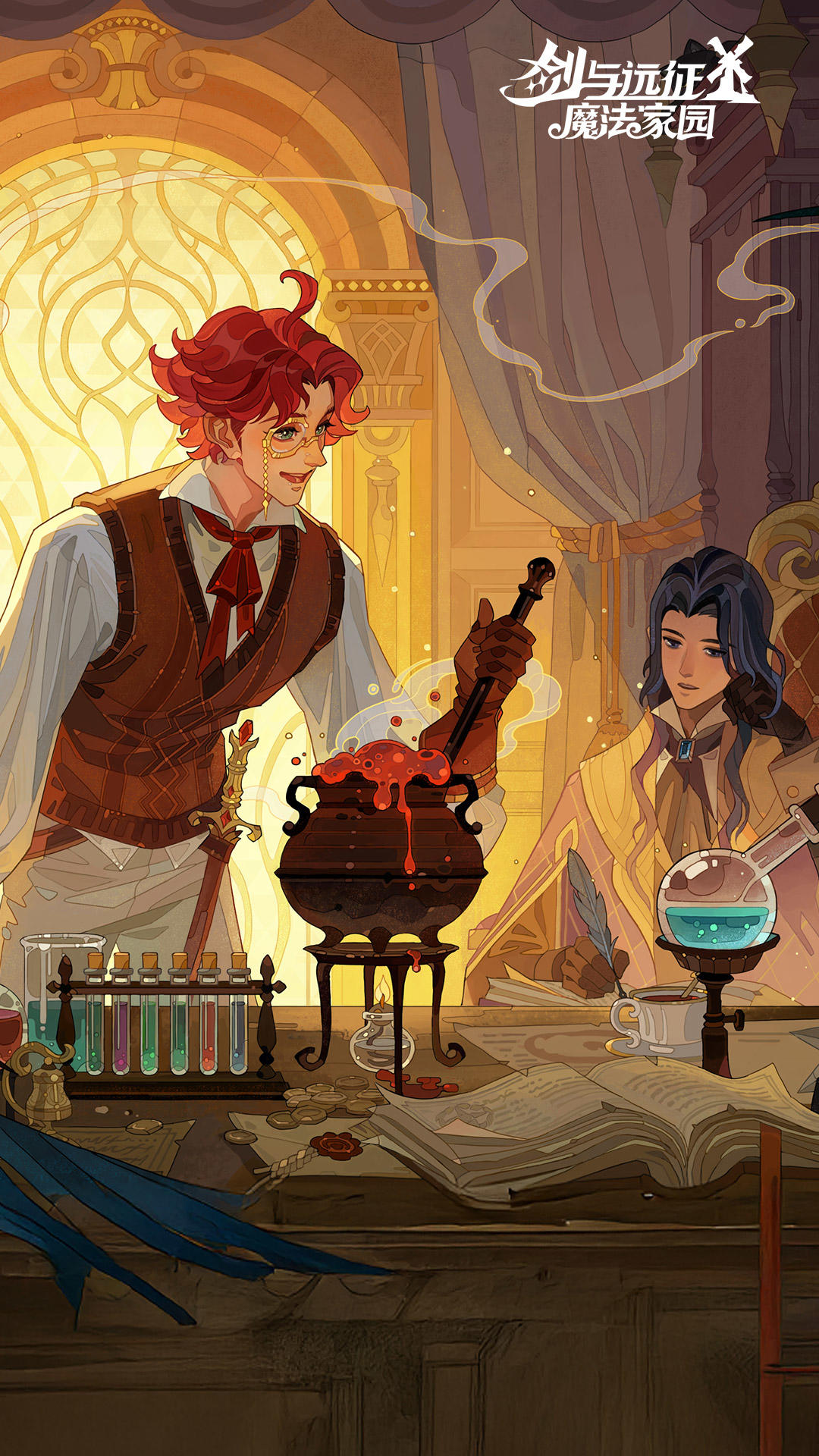 魔药课教室里,坩埚翻涌着猩红的泡沫,试管中的液体发出幽蓝的微光。休搅动着沸腾的药剂,格墨文在一旁记录下魔药的配比。光影交错间,无声的默契在两人之间流淌。