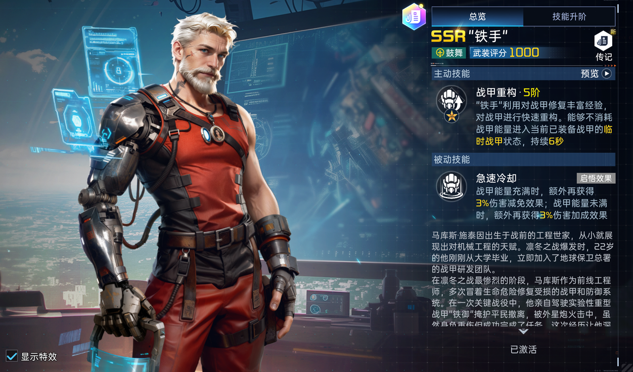 利用对战甲修复丰富经验,对战甲进行快速重构。能够不消耗战甲能量进入当前已装备战甲的临时战甲状态,持续6秒,同时战甲变身动作也算在持续时间里。