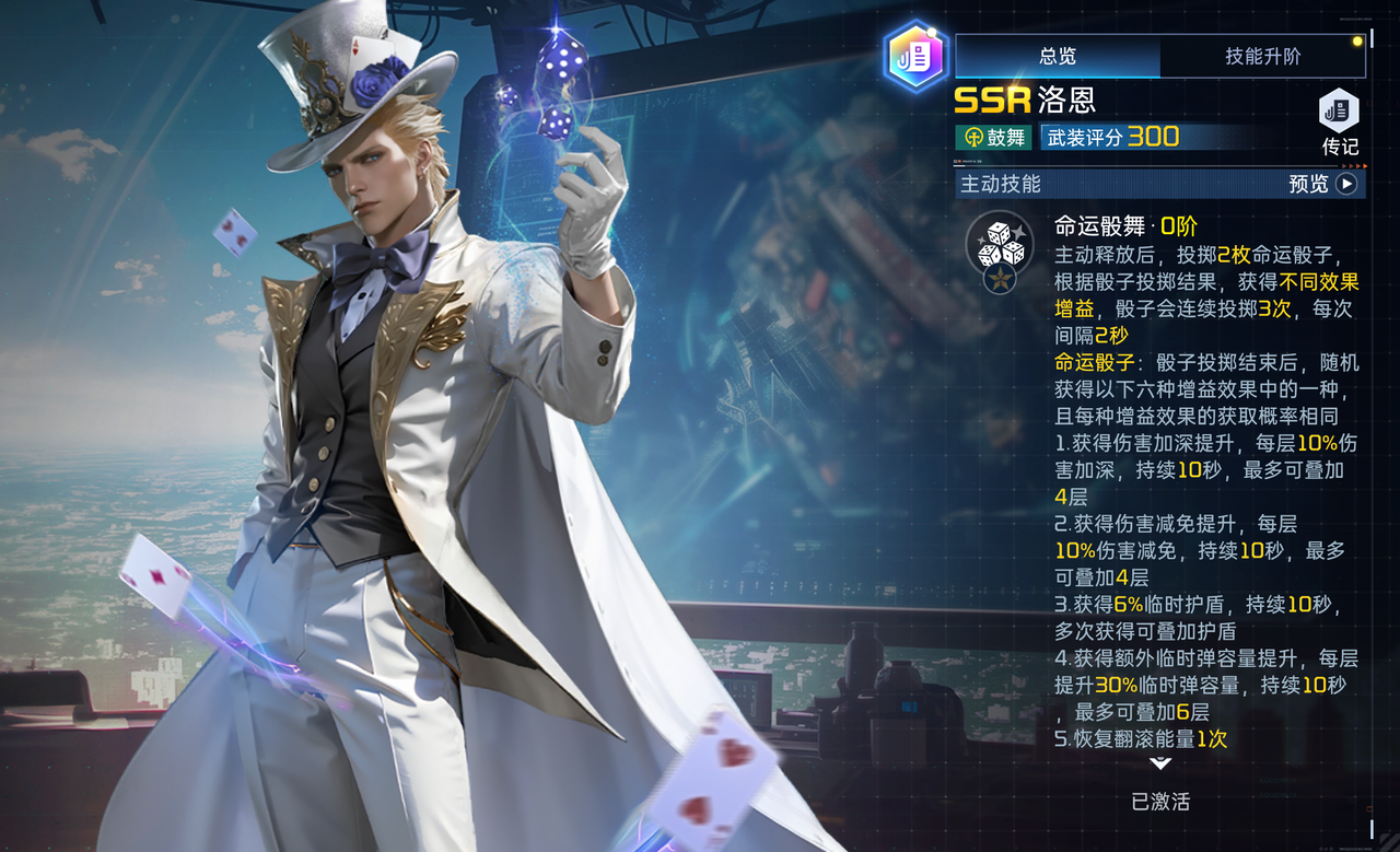 投掷命运骰子获得增益。主动释放后,每次扔2枚骰子,连着投掷3次,每次间隔2秒。骰子能随机赋予6种不同的增益效果。