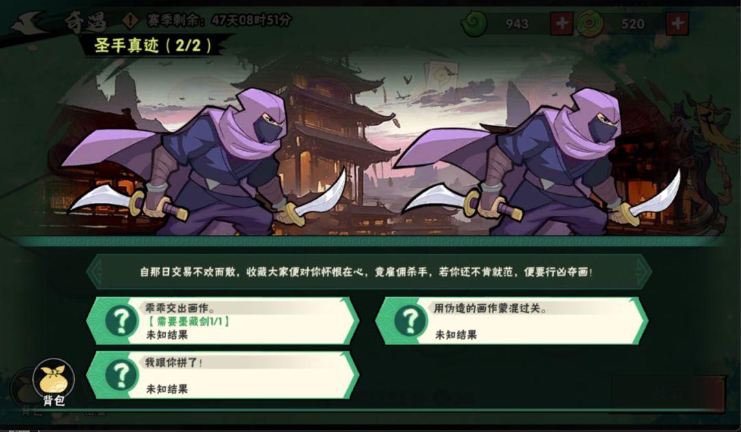 圣手真迹事件,事件1得选“得加钱”解锁事件2,背包里必须有墨藏剑,刷到圣手真迹2,选“乖乖交出画作”获得墨影剑。刷了好多天终于完成任务!~