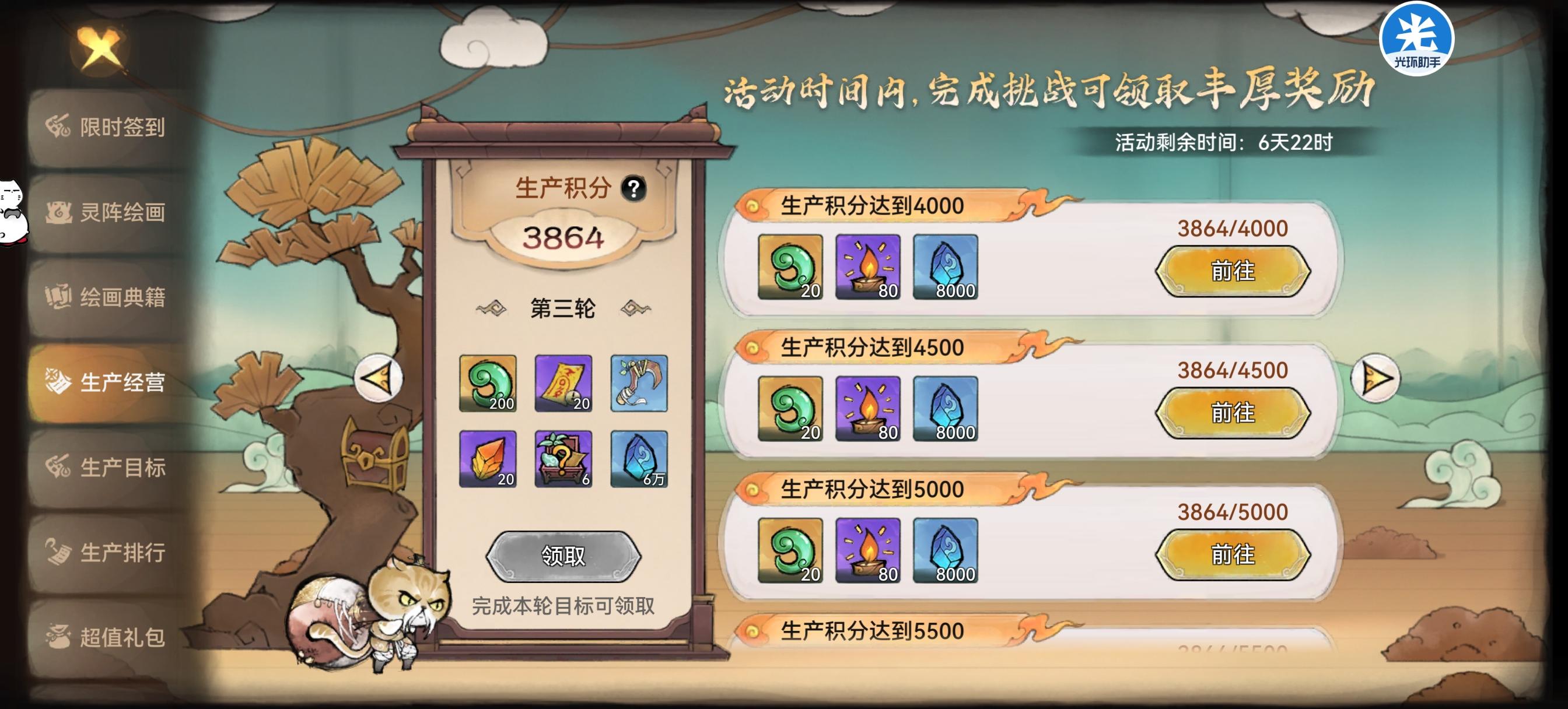生产积分系统:通过自然生产或使用加速符获得,用于达成经营目标并领取累计奖励。活动设有6轮生产经营目标,拉满到第六轮可获得丰厚奖励。