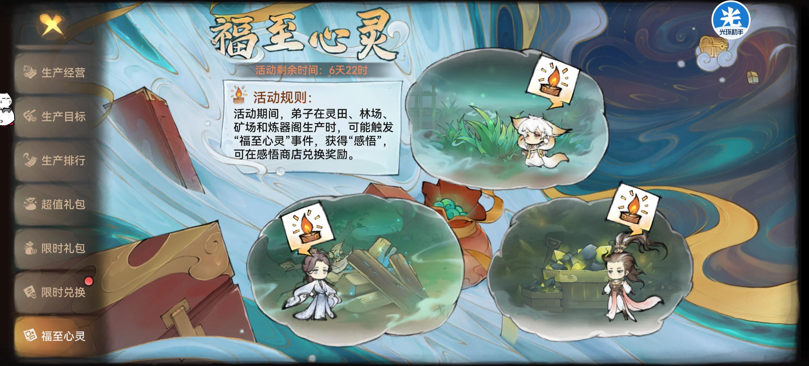 活动期间,弟子在灵田、林地、矿场、炼器、制符、阵石等生产活动时会额外产生感悟值。同时,活动还会根据玩家的生产数量进行排名,排名越高奖励越好。