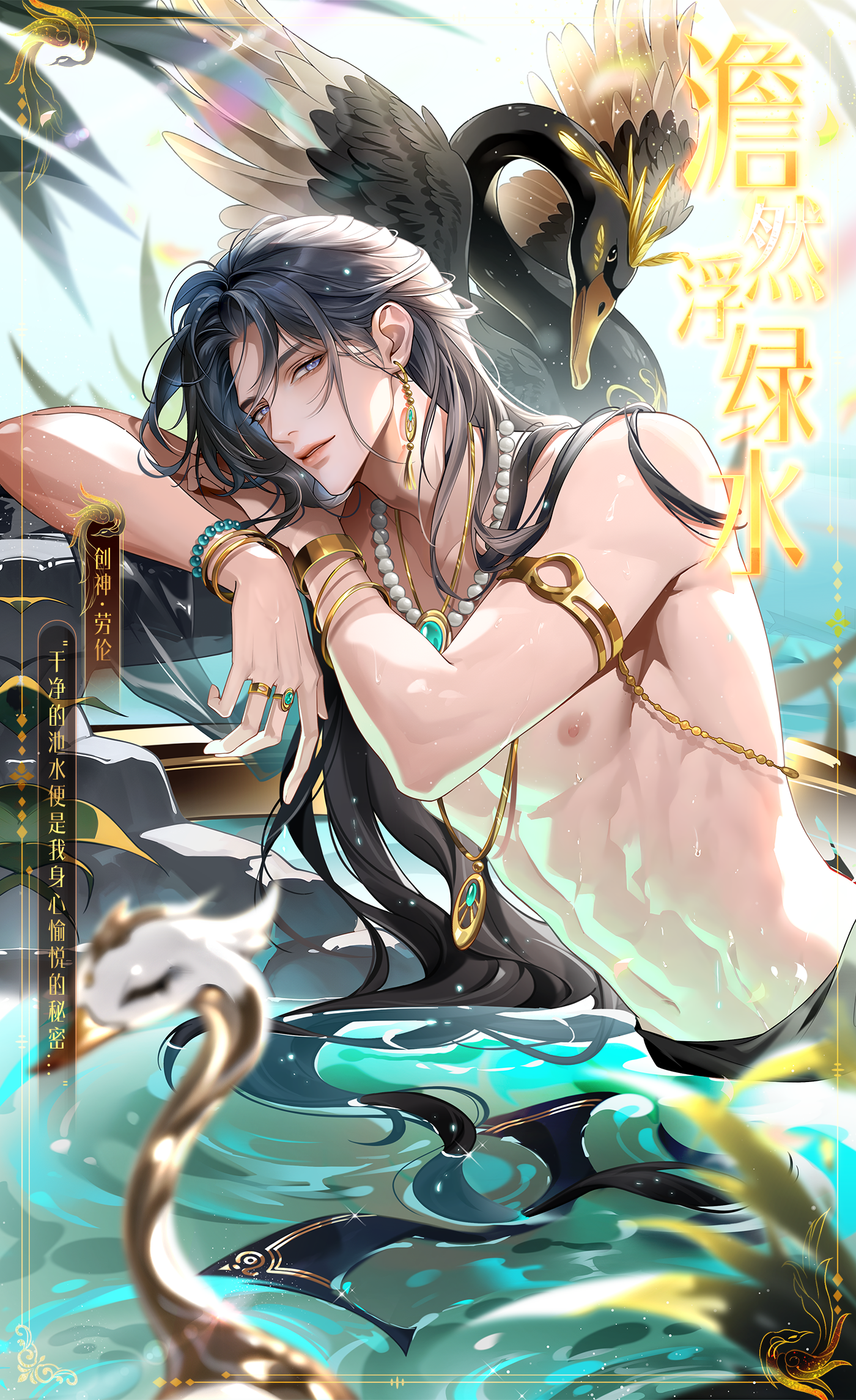 光晕漫过清池,绿水漾着轻波,周身融着天光水色,金饰的微光随涟漪轻晃。他枕臂慵卧,悠然漫透眉眼;黑发浮水,慵懒自成风骨。清泉的波纹与心里的涟漪形成了共振,仿佛是对岸边的伊人发出的无声邀请。