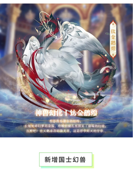 1、神兽幻化系统新增创神130资质“钛金鹅煌”幻化形象,消耗「钛金鹅煌碎片」,即可解锁或升级“钛金鹅煌”幻化形象