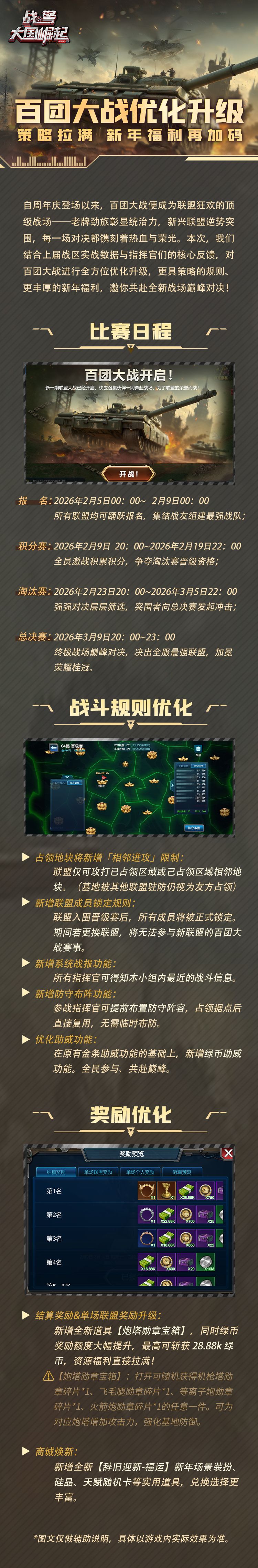 自周年庆登场以来,百团大战便成为联盟狂欢的顶级战场——老牌劲旅彰显统治力,新兴联盟逆势突围,每一场对决都镌刻着热血与荣光。本次,我们结合上届战区实战数据与指挥官们的核心反馈,对百团大战进行全方位优化升级,更具策略的规则、更丰厚的新年福利,邀你共赴全新战场巅峰对决!
