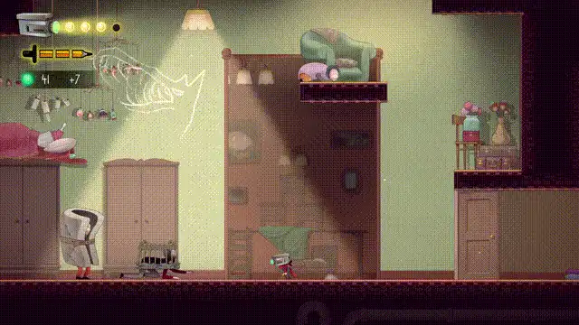 《神来之笔:心之奇旅》的叙事则完全向内折叠,对准了个体幽微的心理深渊。游戏包含了超大地图探索、能力解锁驱动进度等元素,但也加入了极具自身特色的创新机制。主角的基础攻击是铅笔的挥击,节奏明快,这个设计在我看来也是呼应了《神来之笔》这个标题。在游戏中,通过击杀怪物、收集道具等获得绿色经验球,可以用来学习技能,为后续关卡做准备。