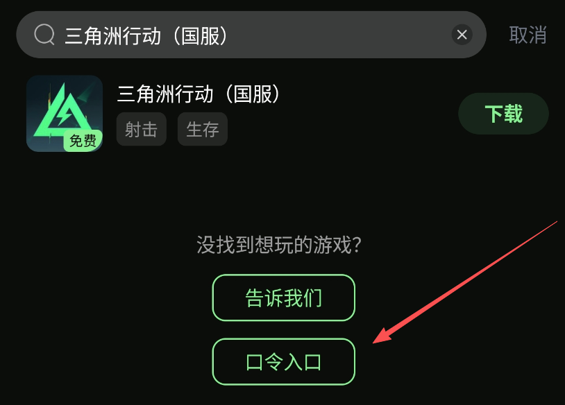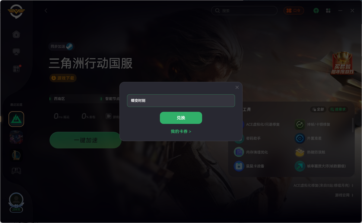 第二步:奇游内搜索三角洲行动,点击下方口令入口,敲口令“蝶变时刻”即可领取会员福利,解锁工具使用!