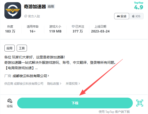 第一步:安卓在taptap下载一个奇游加速器,不要跳转商店;苹果直接去商店安装即可