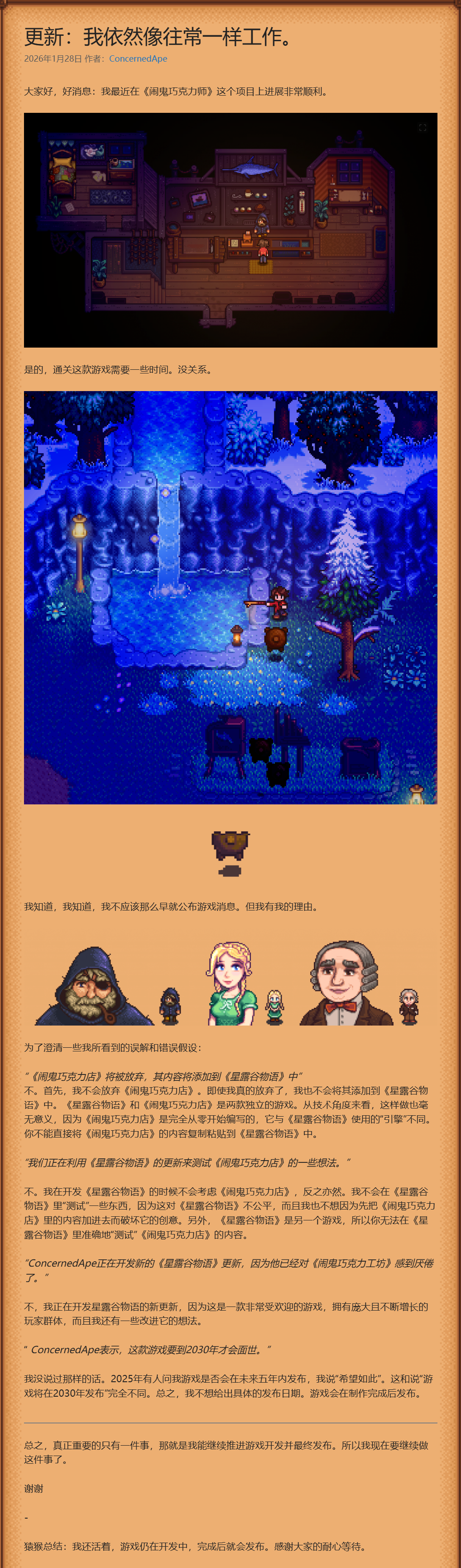 作者坦言新作开发周期较长,也反思了过早公布游戏的举动,但明确不会放弃该作,其内容也不会并入《星露谷物语》,二者是引擎、架构均不同的独立游戏。他还否认了用星露谷更新测试创意、因开发倦怠更新星露谷等说法,澄清从未宣称2030年发售,仅希望五年内推出,游戏完工后便会上线,也感谢玩家的耐心等待。