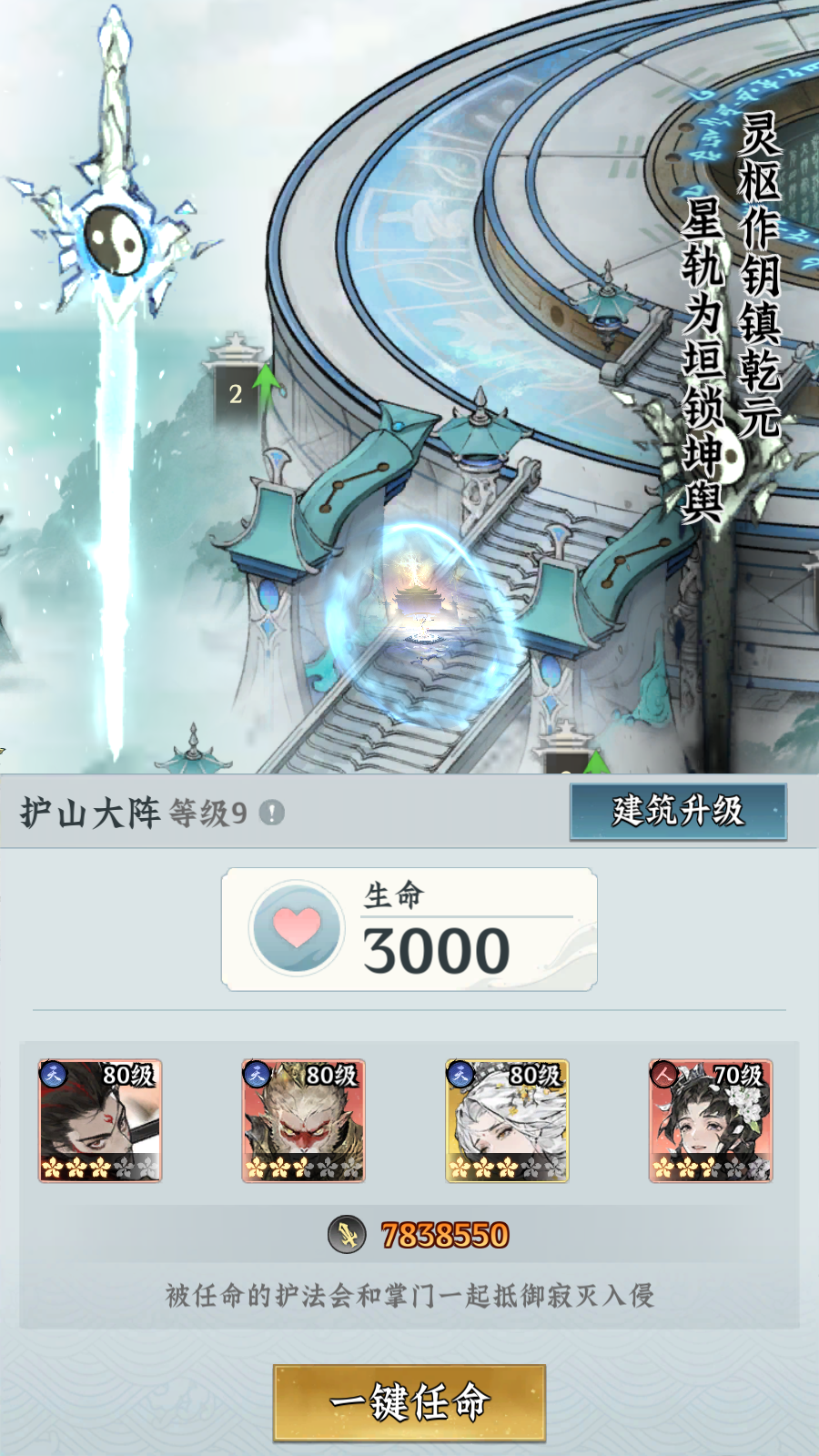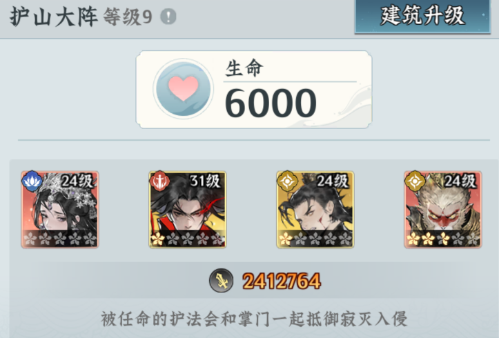 修建护山大阵后,可在寂灭入侵时自动展开防护大阵,在大阵灵力耗尽前可使寂灭无法侵入宗门内部。通过提升大阵等级可增加灵力上限、恢复速度、守山护法栏位,建议前期至少开启一名护法栏位,后续根据寂灭入侵的强度适当提升等级即可。