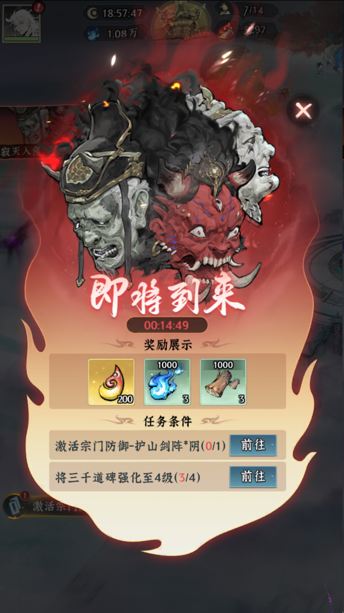 寂灭入侵前三千道藏碑会发出警示,此时可根据提示强化宗门力量,完成条件并成功抵御寂灭入侵后都将获得灵石、灵气、灵木等丰富的奖励。寂灭入侵强度会随着宗门发展而提升,建议修建护山大阵、剑阵等建筑,以及招揽护法、弟子,能为掌教师叔抵御寂灭提供更有力的帮助。
