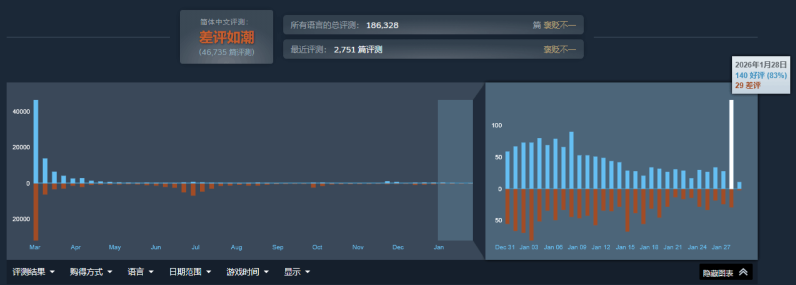卡普空于1月28日针对《怪物猎人:荒野》PC版推出专用优化补丁Ver.1.040.03.01,补丁上线后,游戏Steam评价迅速回暖,据Steam数据显示,更新当日游戏共收到169份玩家评价,其中140份为好评,仅29份为差评,好评率高达83%