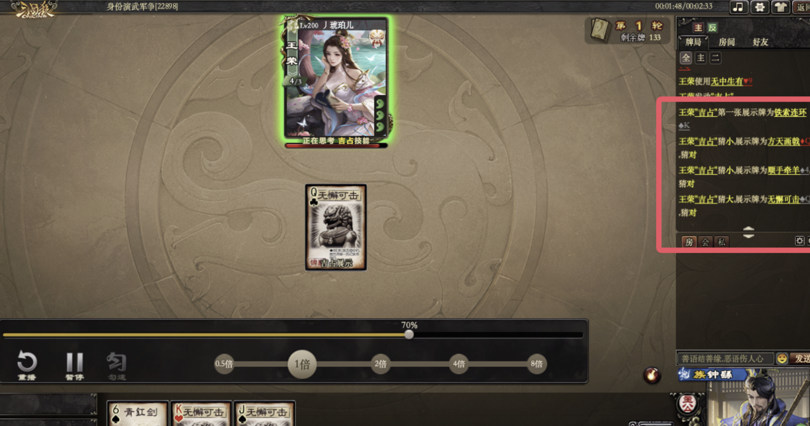 兵乐同在下家判定区:遵循先来后判原则,假设乐先来,即第一张判兵,第二张判乐。钟繇在处理这种情况时,替换后的第一张,第二张是下家的判定牌。优势局诫厉控场:核心是将装备/闪/酒这些没有进攻能力的牌控给对面