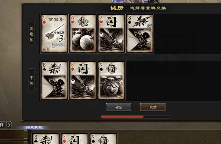 三,诫厉的控顶机制观看其牌名字数较多的手牌:牌堆结构和一个武将回合外手牌大致结构,这些就是纯经验而谈。看之前要想清楚大概率能看到什么牌,有目的,有想法的看。牌堆的四字牌最多,看后置位未行动的角色大概率看到的是四字牌。观看行动后角色可能看到的是清一色的基本,或一件没用的装备。X为你本回合使用的牌名字数的最大值:特殊,钟繇装备【青龙偃月刀】或【雌雄双股剑】会看五。诫厉放回牌堆顶的顺序:在诫厉的处理区“牌堆顶”和“手牌”选取等量的牌,按照从左到右的顺序,下面选的第一张,替换上面选的第一张,以此类推。被替换的牌按照原来的位置顺序在放回牌堆顶,也就是左边第一张为牌堆顶第一张。以王荣【吉占】验证,下图替换完放回牌堆顶的第一张为K铁锁,依次是Q方天,4顺手,Q无懈。如果实战中下家真的是队友王荣,把复杂的问题简单化只换一张,不增加多余的思考和操作,才是减少出错的上策。