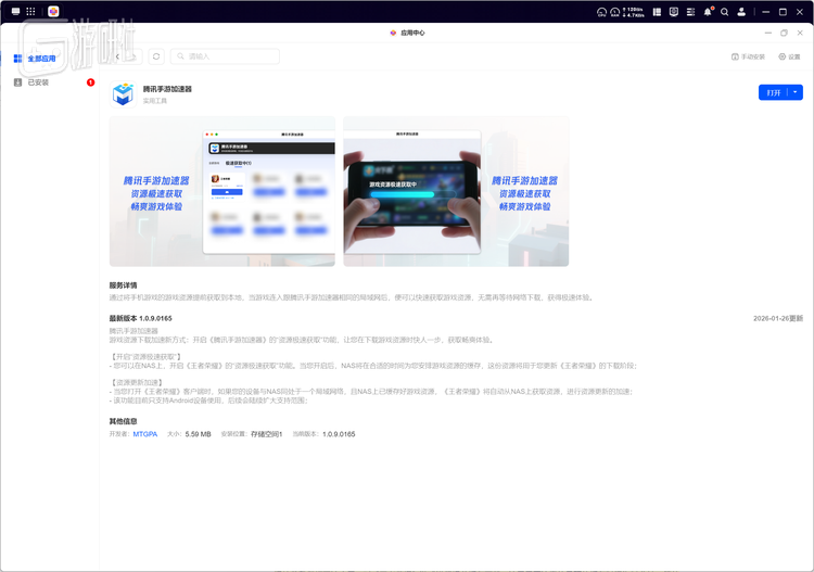 正式安装方式上,也非常贴心的提供了电脑版本以及手机端两种方式。我们先说电脑端。在确认系统最新之后,就可以在绿联云客户端应用中心下载安装「腾讯手游加速器」。