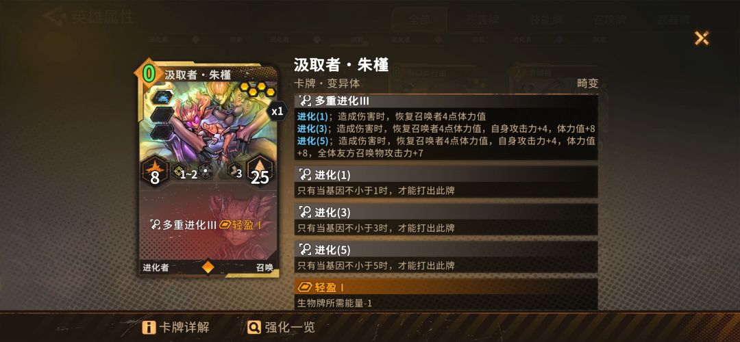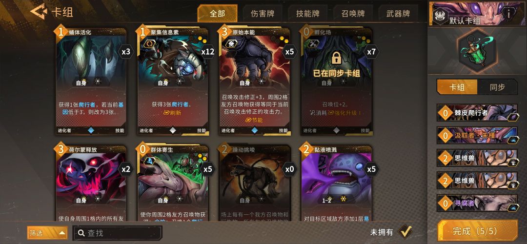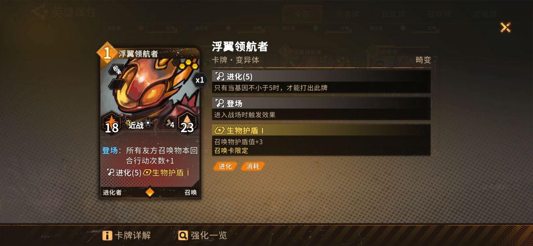 主要打法:先弄一个非进化的召唤物,要么就是带减费的0费召唤物,没有的话就用技能招一个爬虫,然后用招其他几个进化召唤物,不够的话注意用思维兽,可以从牌库里拉进化召唤物,使基因到5。再招专属卡汲取者(她进攻距离为2,有几段进化,可以随着回合成长,如果一两回合结束不了对局,她就变得非常重要)。这个时候要注意召唤位,最好带个孵化场。最后招最最重要的浮翼领航者(他主要是可以让所有召唤物攻击次数+1,升满级后+2)。然后,你就可以看到一群召唤物围上去,围着敌人一人啄个好几下,把怪啄死。最大化的情况下,围着有6个,外围再加上汲取者,这就是最大伤害了!