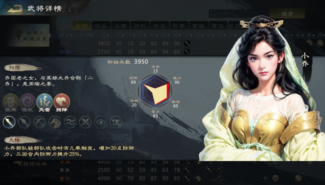 除了貂蝉之外,二乔是三囯中最引人关注的美女了,而其中的小乔更是在许多游戏中被设计成一个可爱的小妹妹法师。在《代号:三国王者》中小乔的魅力高达96,这强大的魅力值会大幅提高其"招降"的命中率,不过由于防御值只有20,因此小乔在施放计谋之前必须先能𠄘受敌军的攻击。因此小乔的武将技"天惜”就是一个可以在遭受敌军攻击时触发的防御技。虽然提升25%的buff看似不多,但是只要小乔没被送回"泉水"(家),她就有机会对多个敌军造成严重的伤害!
