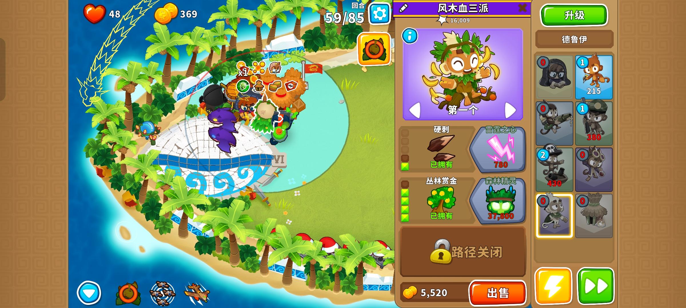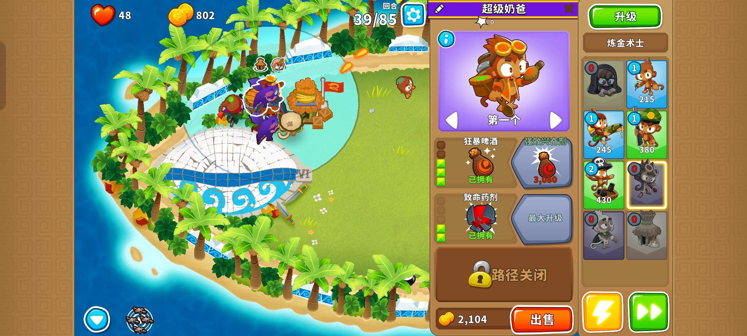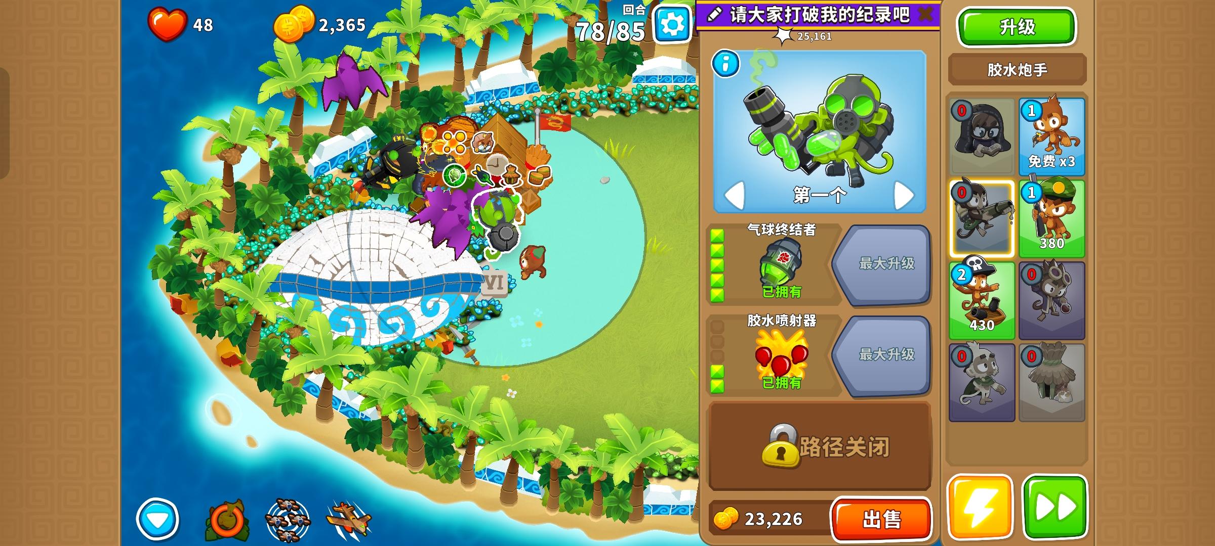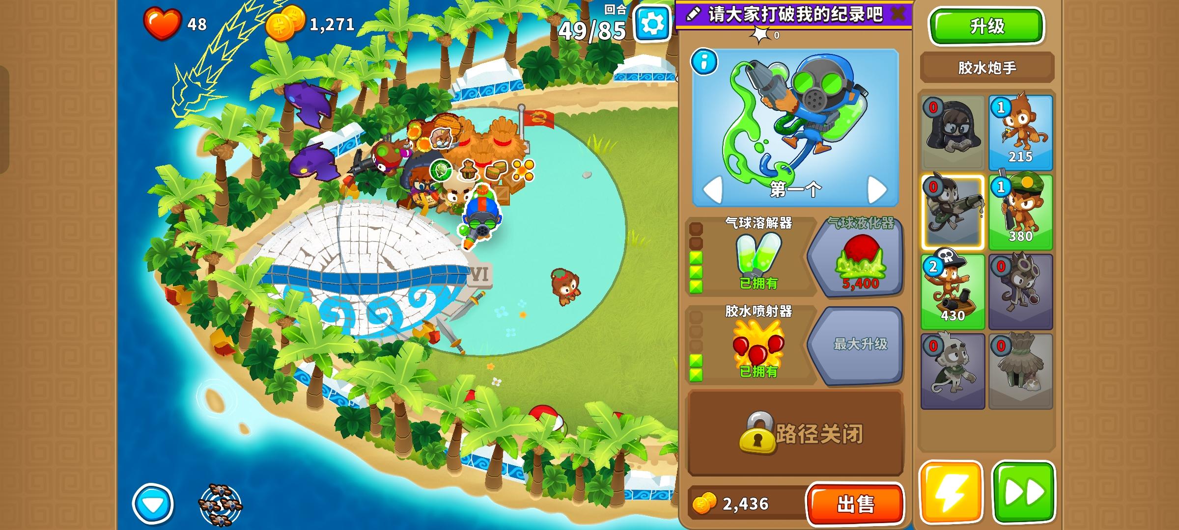 之后也是先将猴子村升到203存钱,但第49回合就需要320-420胶水炮手的帮助来通过。钱够了就把毛毛升到025,德鲁伊升到140-150。此时可以把猴子村升到204让德鲁伊赚更多的钱,钱够了就把胶水炮手升到520来通过!