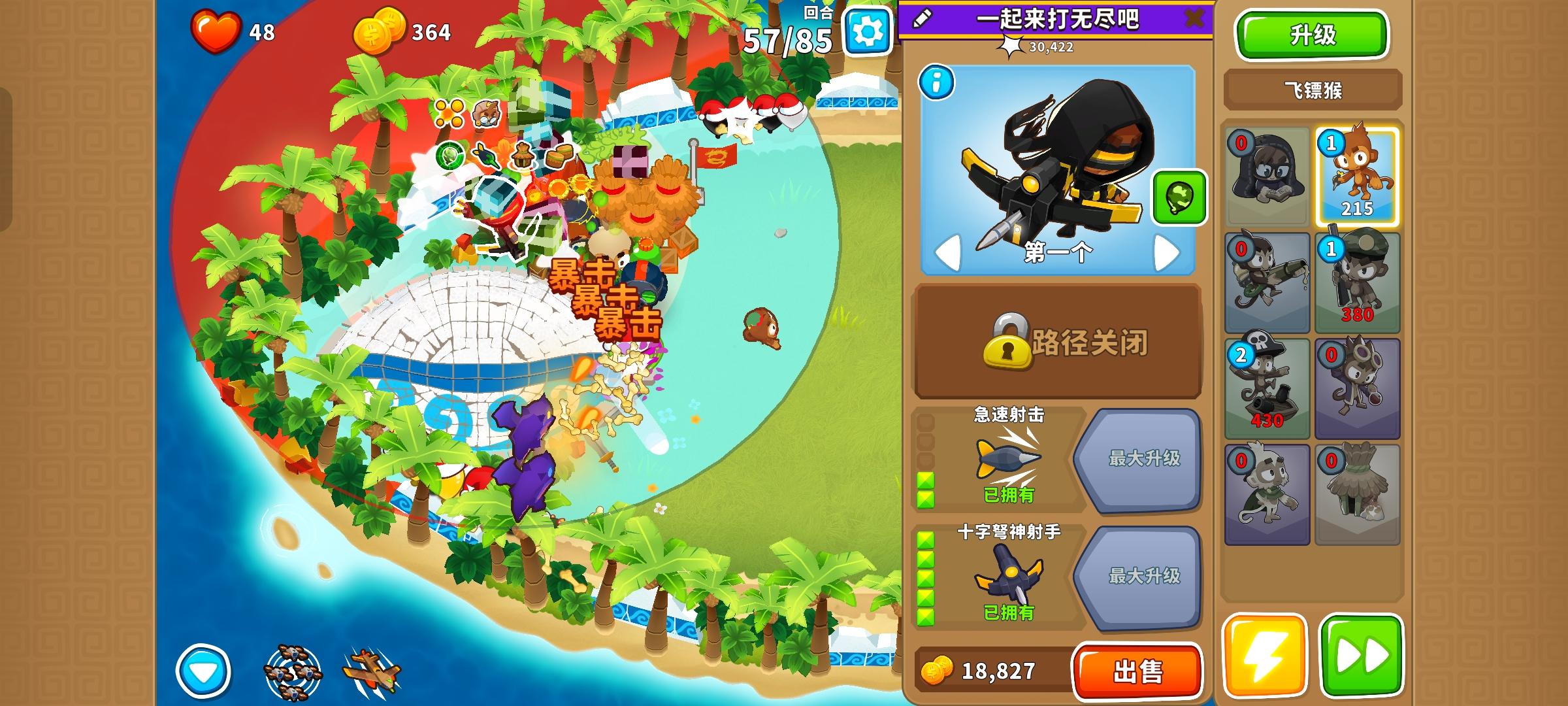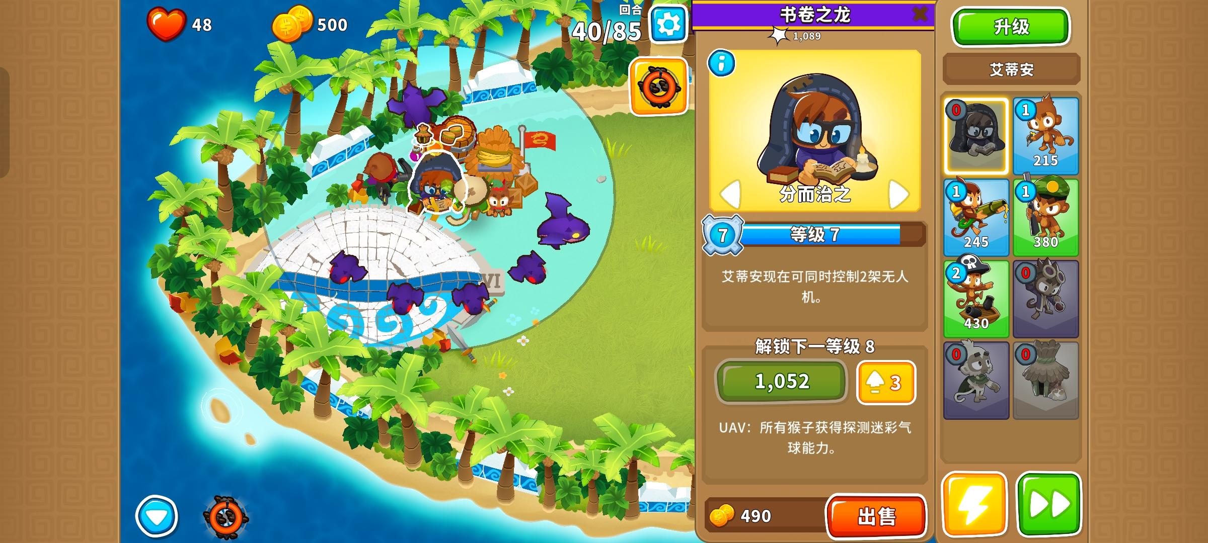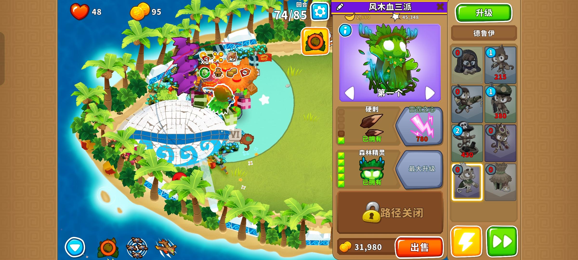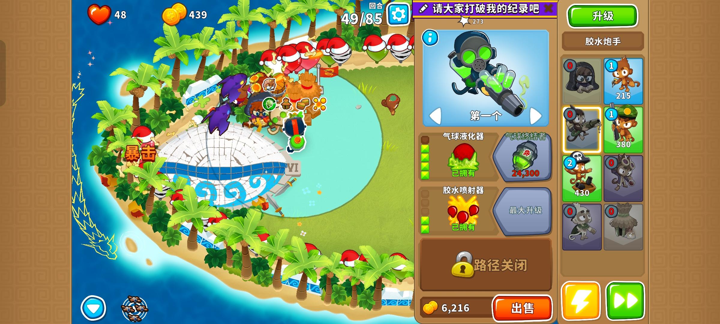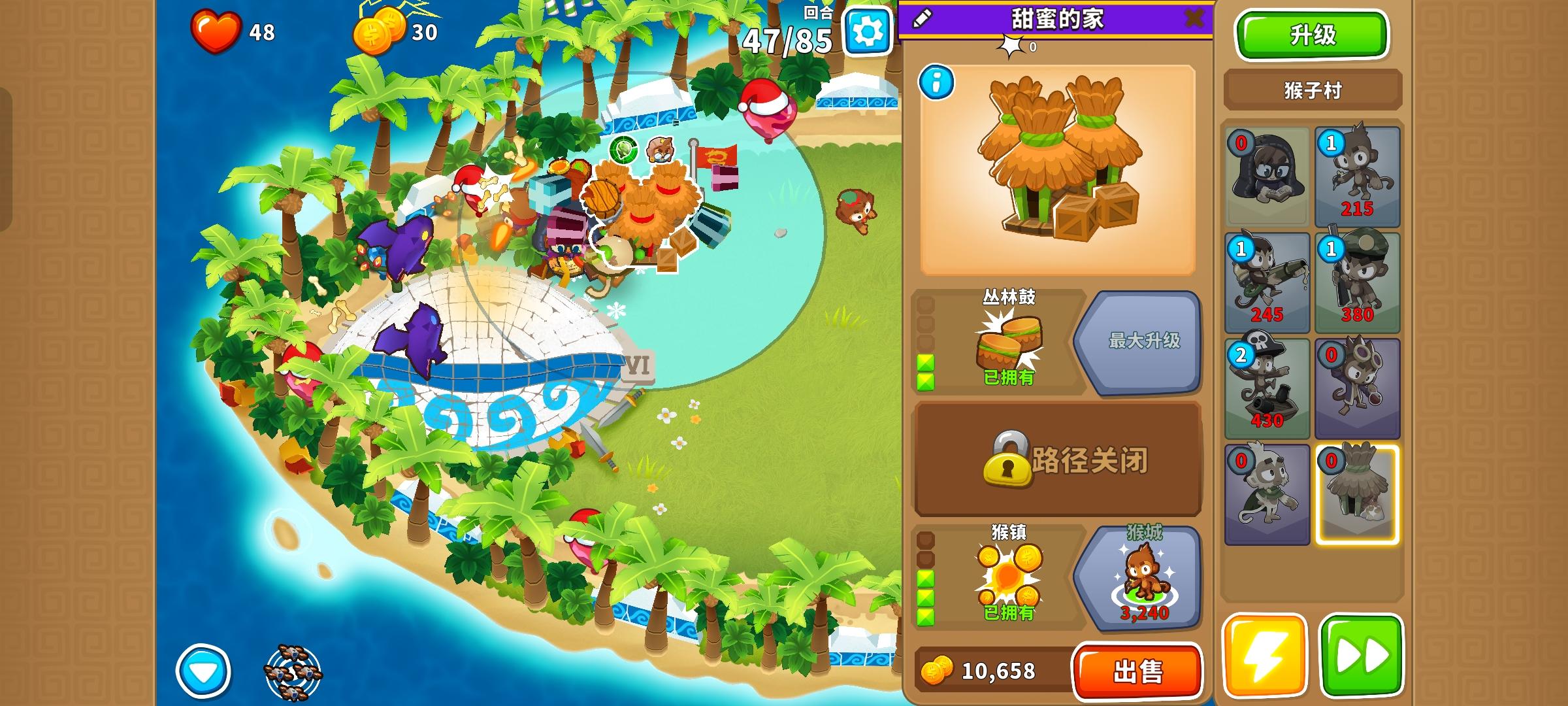 之后也是先将猴子村升到203存钱,但第49回合就需要320-420胶水炮手的帮助来通过。钱够了就把毛毛升到025,德鲁伊升到140-150。此时可以把猴子村升到204让德鲁伊赚更多的钱,钱够了就把胶水炮手升到520来通过!