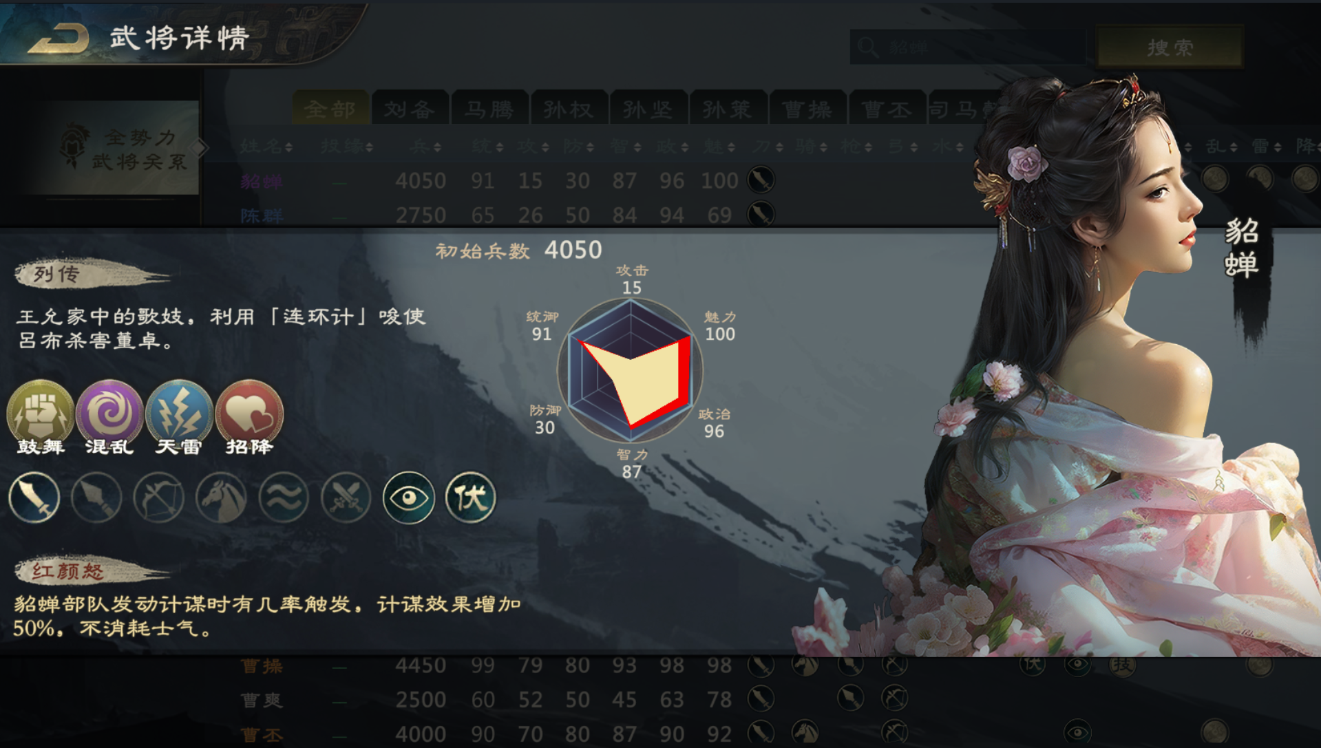 作为三国第一美女,貂蝉可以释放包括“鼓舞”、“混乱”、“天雷”及“招降”等所有计谋。计谋全是AOE技能,威力十分强大,因此释放计谋的代价就是要耗损自身部队最重要的数值"士气"!"士气"不但直接影响了部队的攻防,同时也决定了先后动的顺序,因此在《三国策:万人策略对战》的战局中,"士气"可以说是当之无愧的第一要素。而貂蝉的技能"红颜怒"一旦触发,不但可以让计谋效果提升50%,更可以让本次计谋释放不耗士气,因此,貂蝉的"红颜怒"可以说是法师系的最强技能之一!