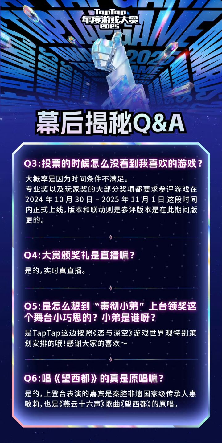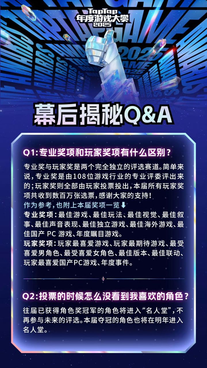本届TapTap年度游戏大赏采用专业奖与玩家奖双独立评选赛道,专业奖由108位游戏行业专业评委评选产生,涵盖最佳游戏、最佳玩法、最佳视觉、最佳叙事、最佳声音表现、最佳独立游戏、最佳海外游戏、最佳国产PC游戏、年度瞩目游戏共10类奖项;玩家奖则全部由玩家投票选出,本届共收到数百万张玩家选票,包含玩家最喜爱游戏、玩家最期待游戏、最受喜爱男角色、最受喜爱女角色、最佳版本、最佳联动、玩家最喜爱国产PC游戏、年度事件8类奖项。往届已获得角色奖冠军的角色会进入“名人堂”,不再参与后续评选,本届夺冠的角色也将在明年加入名人堂。参评游戏需满足时间条件,专业奖及玩家奖大部分奖项要求游戏在2024年10月30日-2025年11月1日正式上线,版本与联动类奖项则要求参评版本在此期间更新,未满足该条件的游戏不会出现在投票列表中。