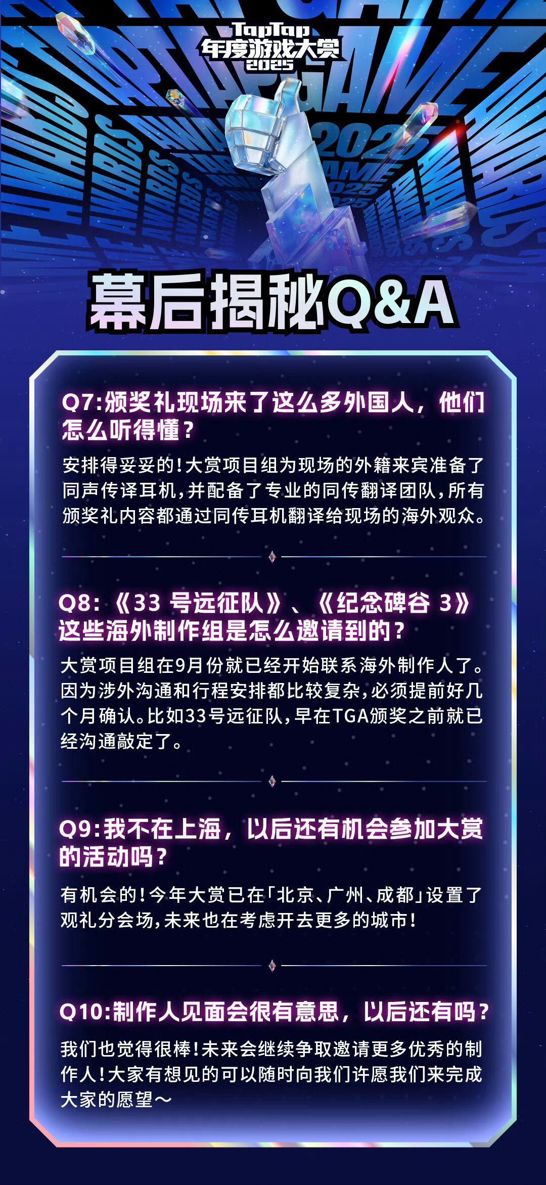颁奖礼为实时真直播,现场还藏有不少巧思,《恋与深空》“秦彻小弟”上台领奖的环节,是TapTap按照游戏世界观特别策划的;《燕云十六声》歌曲《望西都》的现场表演嘉宾,正是该曲原唱、秦腔非遗国家级传承人惠敏莉。针对现场外籍来宾,大赏项目组准备了同声传译耳机,并配备专业同传翻译团队,确保海外嘉宾能清晰了解颁奖礼内容。海外制作组的邀请工作早在9月就已启动,因涉外沟通与行程安排复杂,需提前数月确认,《33号远征队》更是在TGA颁奖前就已敲定参与行程。线下观礼方面,今年已在北京、广州、成都设置观礼分会场,未来还计划拓展至更多城市,同时后续也会继续邀请更多优秀游戏制作人开展见面会。