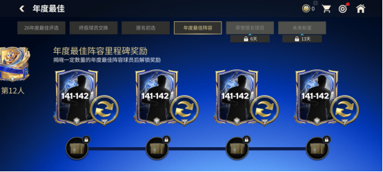 揭晓年度最佳阵容球员可以获得139+混合球员奖励,并能揭晓一名年度最佳阵容球员,累计揭晓年度最佳阵容球员达到对应数量后,可以获得141-142能力值年度最佳球员卡、年度最佳刷新代币奖励!