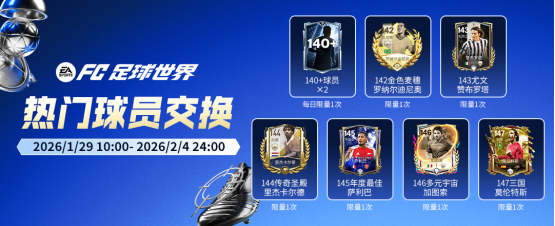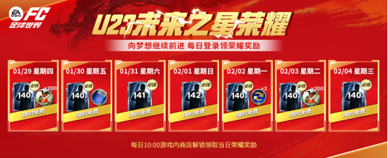 1月29日-2月4日,每日登录游戏即可领取U23未来之星荣耀奖励,140-142能力值混合球员、年度最佳冠军代币、年度最佳刷新代币在内的海量福利免费领!