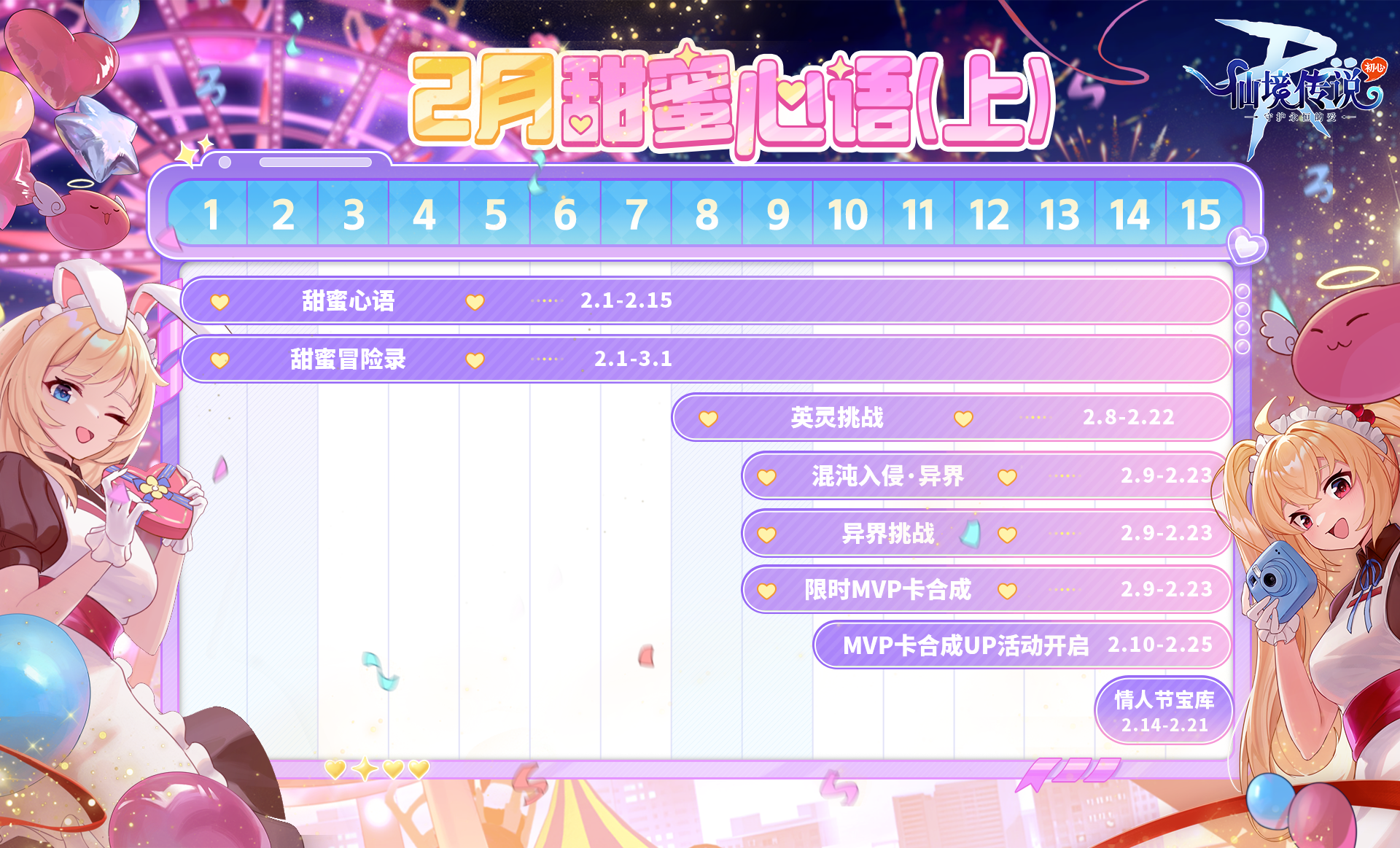 活动期间,「甜蜜冒险录」开启,通过完成各项活动,获得经验提升冒险录的等级,领取各类稀有奖励。