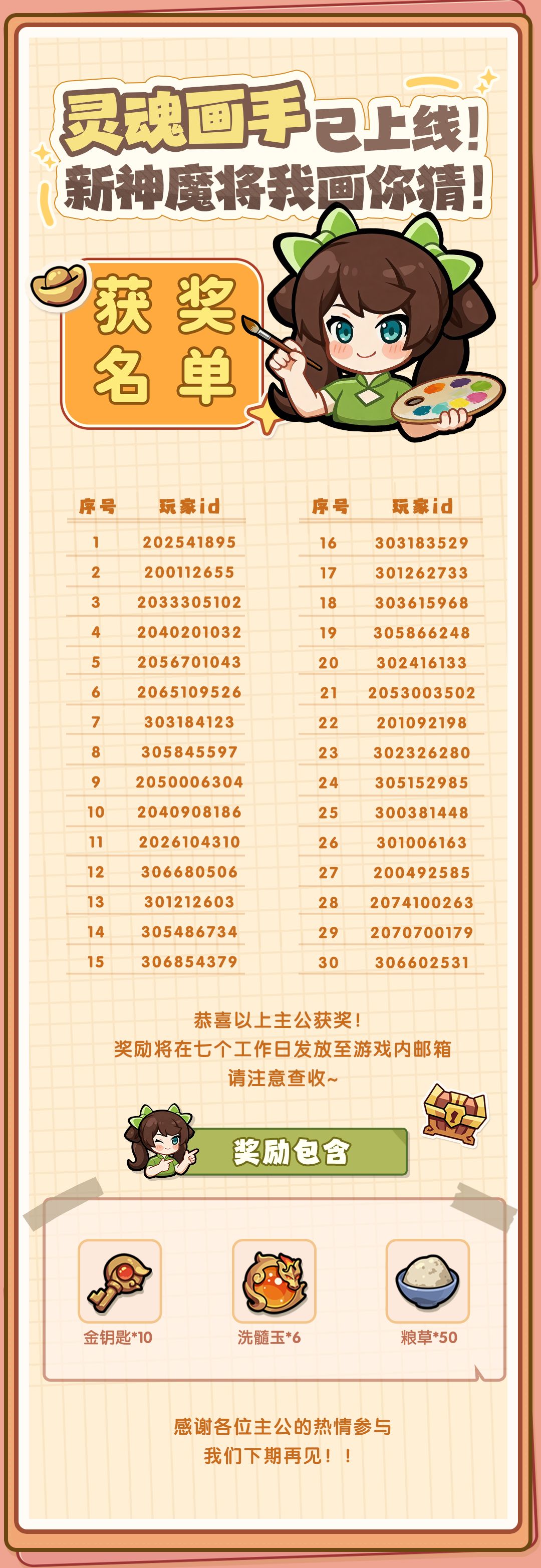【中奖公示】「我画你猜」有奖竞猜已圆满结束,恭喜以下中奖主公!奖励将于7个工作日内发放,请获奖主公注意查收游戏内邮件噢~