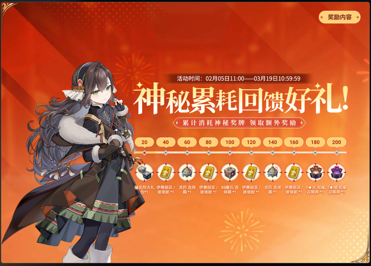 活动期间内,通过消耗神秘书签,达成消耗数量后,即可解锁对应奖励,共可获得催化剂礼包×15、伊赛丽亚/迪埃妮自选箱×4、灵药选择箱×2、Lv.88魔石选择箱、5★光属性祝福召唤券、5★暗属性祝福召唤券。