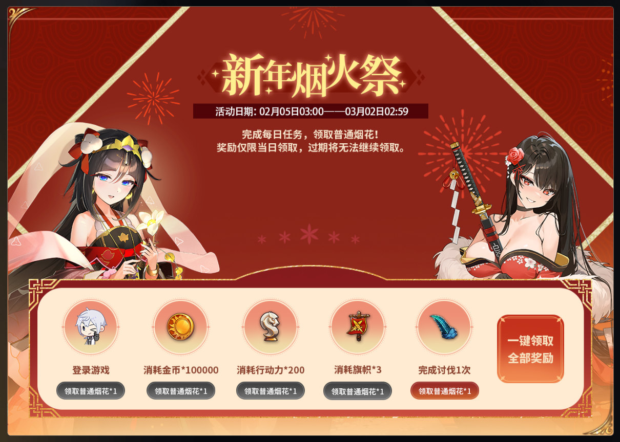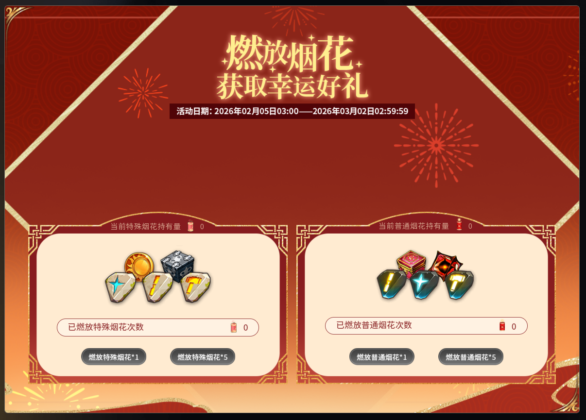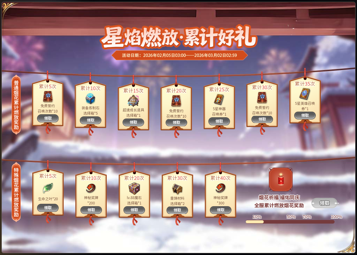 通过完成每日任务,可获得普通烟花,燃放普通烟花,可从金币×10000、稀有催化剂选择箱、下级万能装备强化石、下级万能饰品强化石、下级神器强化石中随机获取一个。累计燃放普通烟花达到一定数量,可解锁对应奖励,共计可获得免费誓约召唤次数×30次、装备炼制石选择箱×5、灵药选择箱、五星神器召唤券、五星英雄召唤券。
