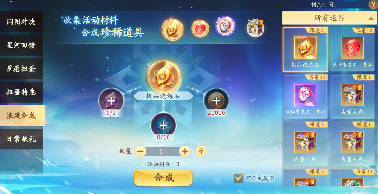 消耗琉璃天穹和指定材料即可合成相应道具,异性套装石可通过合成转化为同性套装石哦!