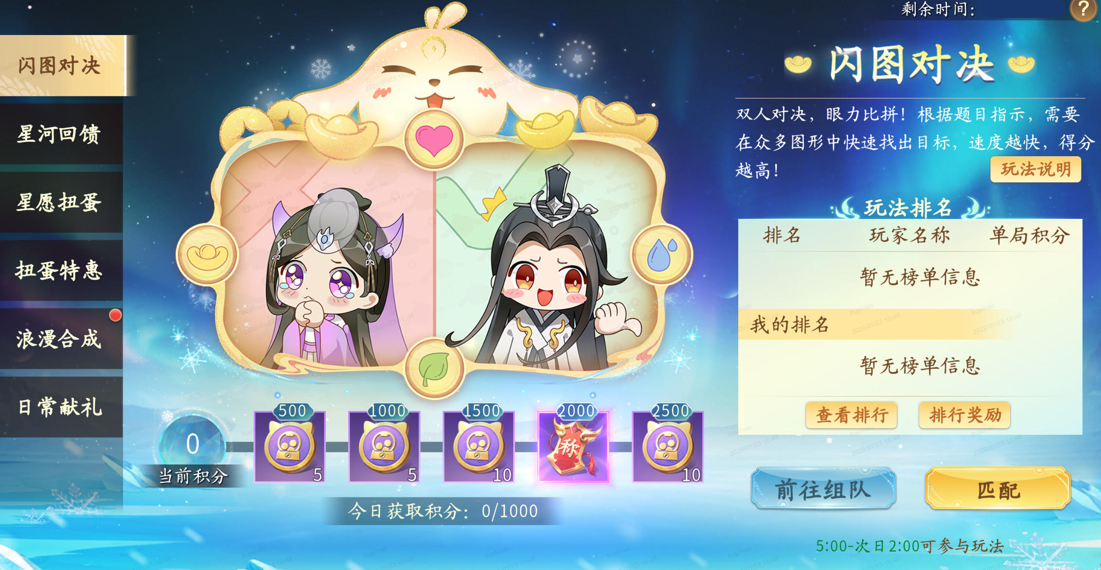 听说扭蛋机需要超强眼力?不妨来一把“闪图对决”练练手吧~游戏内有3个回合,各回合将给出1个指定形状作为题目,每波会在界面随机刷新出不同图标,需快速选中题目形状所在位置方可得分!每场游戏会根据各波次选对图形的速度获得不同积分,速度越快积分越多!累计积分达到指定值还可获得称号和扭蛋币!每日22点根据单局积分和上榜时间进行排名,前20名均可获得奖励。
