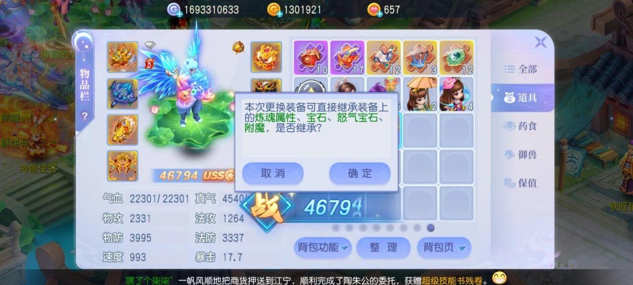 我们准备好装备以后,在更换装备的时候它会有一个提示,本次更换装备可以直接继承装备上的炼魂宝石等等一些道具!我们直接选择取消!当然更换装备前,我们要把原有宝石怒气石全部拆下来!