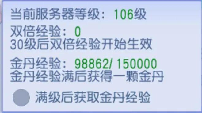首先我们来说第1个!就是经验转换成金丹!众所周知当我们的等级比服务器的等级高三级以后!就可以通过经验兑换金丹!金丹什么作用呢?就是加速点元神!