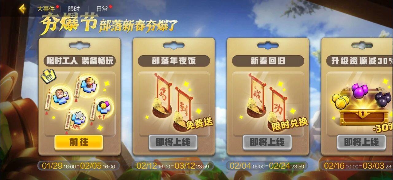 以上就是给首领们准备的新年福利,希望能切实帮助首领们更好建设部落,开心过大年!新的一年,持续夯爆~
