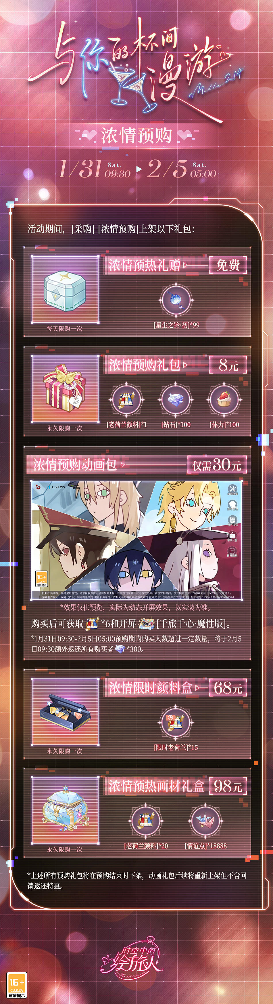 ► 30元[浓情预购动画包],可获得开屏[千旅千心·魔性版]+[老荷兰颜料]*6,购买人数超过一定数字,将在2月5日09:30额外返还所有预购者[钻石]*300。