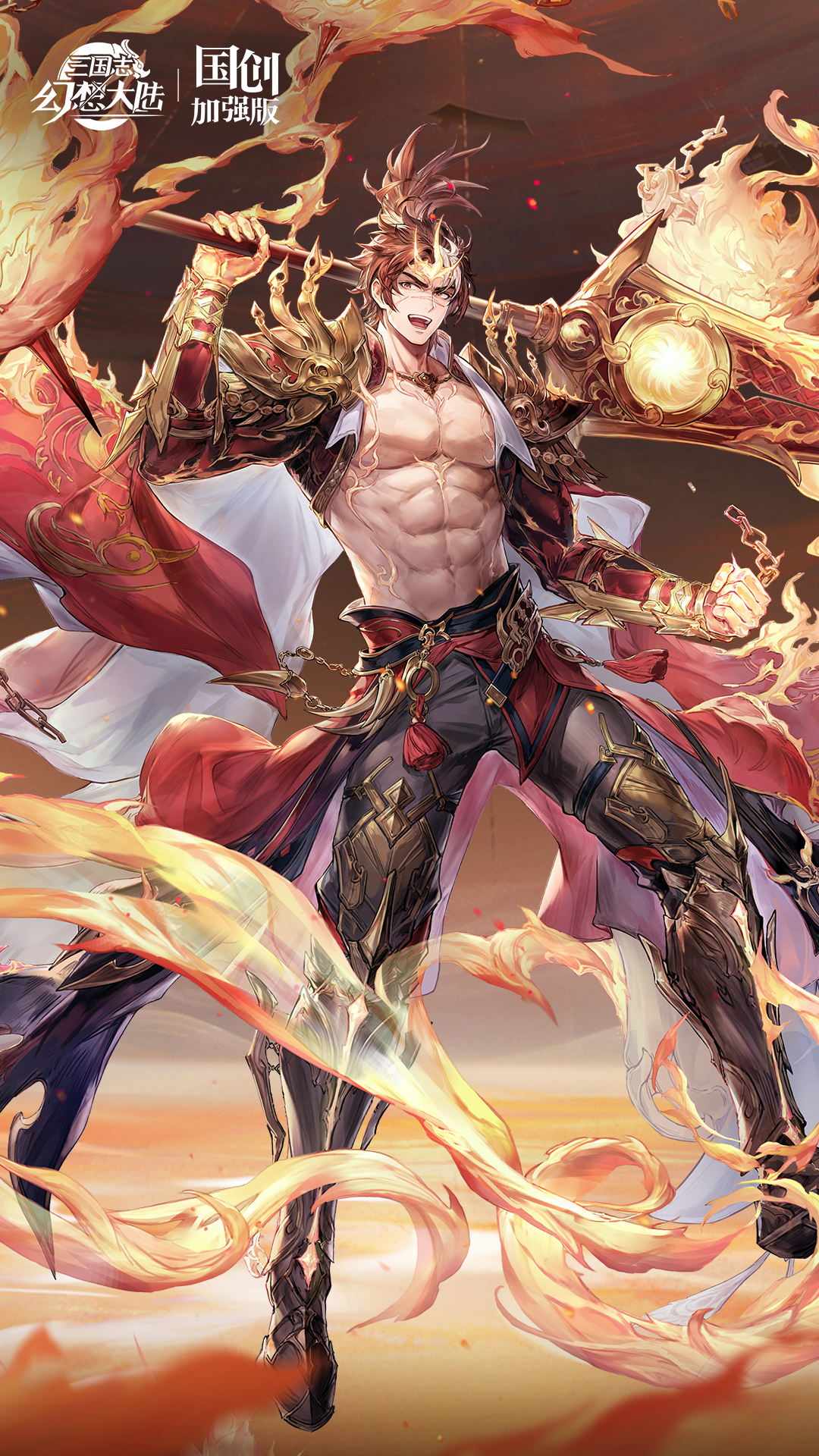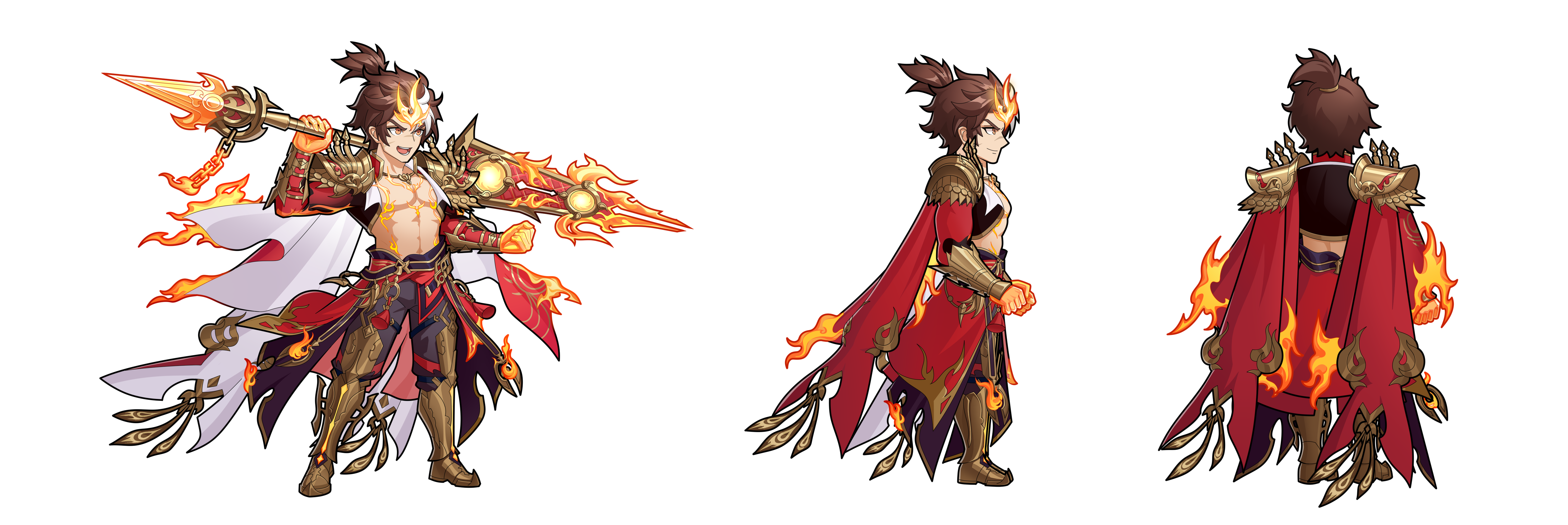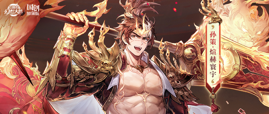 本次设计以“火神”为主题,勾勒出一位威风凛凛的火神形象。孙策身着金红肩甲,袒露胸膛尽显远古神明的磅礴气魄与桀骜不羁。作为火神,他周身环绕着熊熊烈焰,炽热光芒流转不息,然而这烈火无法伤及他分毫,反而化作他披风上的一抹装饰。