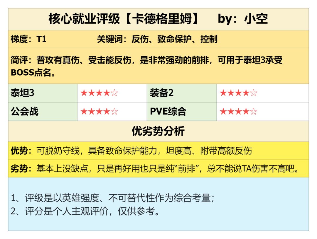 护盾&队友保护:释放终结技可给自身附加100%护盾,可以脱奶守单线;在释放技能时还能给友方施加护盾,有较不错的队友保护能力。简单来说,大家可以将卡德格里姆当成一个超肉的前排使用(可以堆10-14W生命值,一个终结技再套10W护盾,肉得一匹),适用于所有需求前排的场景。其额外拥有的致命保护机制,可以在泰坦3、公会战有较好的发挥。