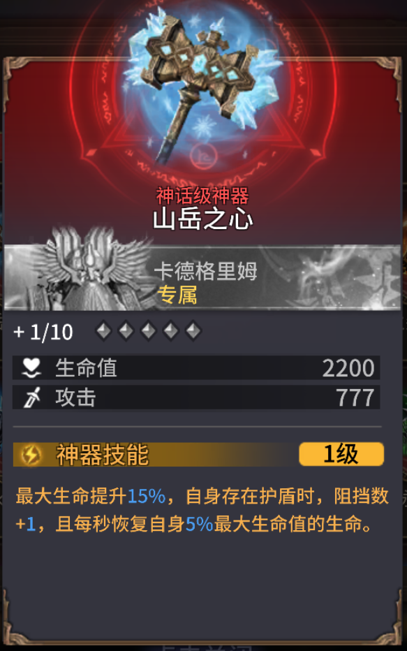 英雄上线后会同步解锁专武打造,专武山岳之心可额外提高生命值上限、续航,提高卡德格里姆生存。由于专武比较难强化,一般可以选择堡垒戒指,可提升减伤、阻挡数量。