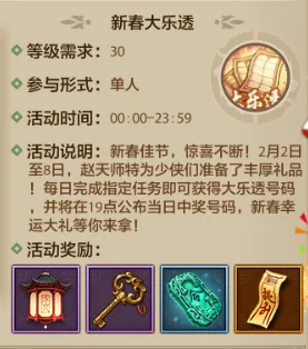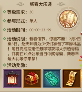 在2月2日-2月8日期间,少侠们只需完成每日指定任务,就能轻松获得大乐透奖券,已获得的奖券可一直保留至活动结束,不用担心错过任何一次中奖机会,每日19点准时公布当日中奖号码,每一次开奖都有新期待,重磅惊喜大礼静候各位少侠前来解锁!