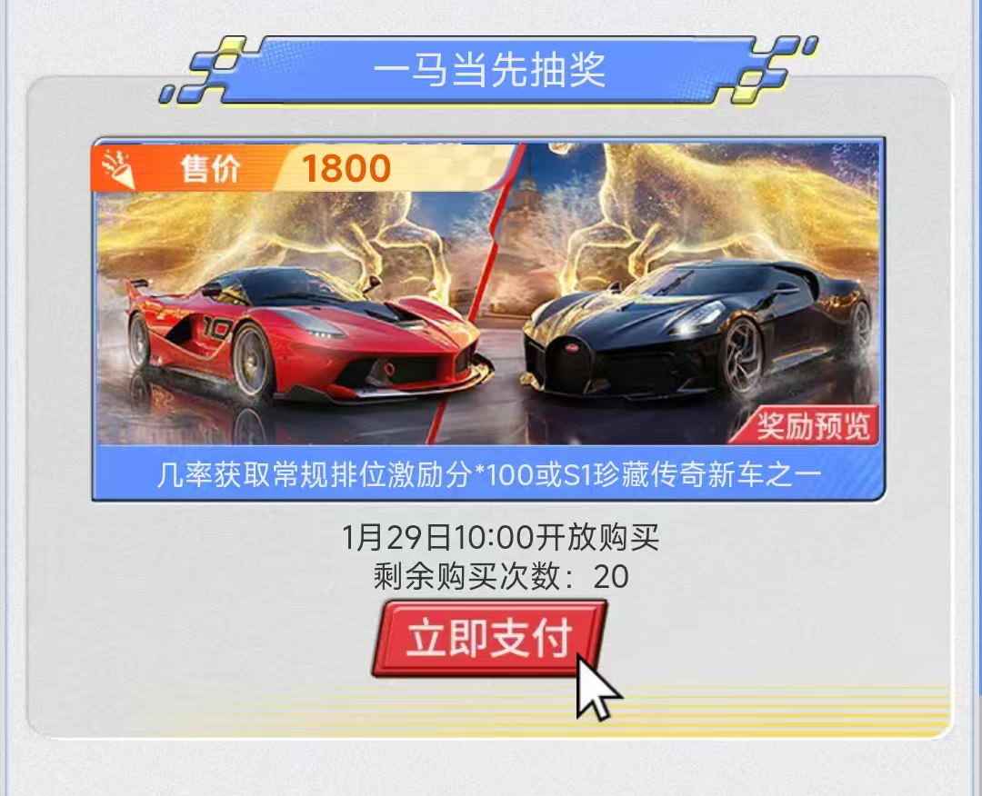 还有马年专属“一马当先”抽奖活动登场!1月29日10:00开放购买,支付后就有机会获得常规排位激励分*100或驭影双王【极限组】珍藏传奇法拉利 FXX K '14、布加迪 La Voiture Noire '19其中之一,两大顶级超跑静待天命欧皇解锁!