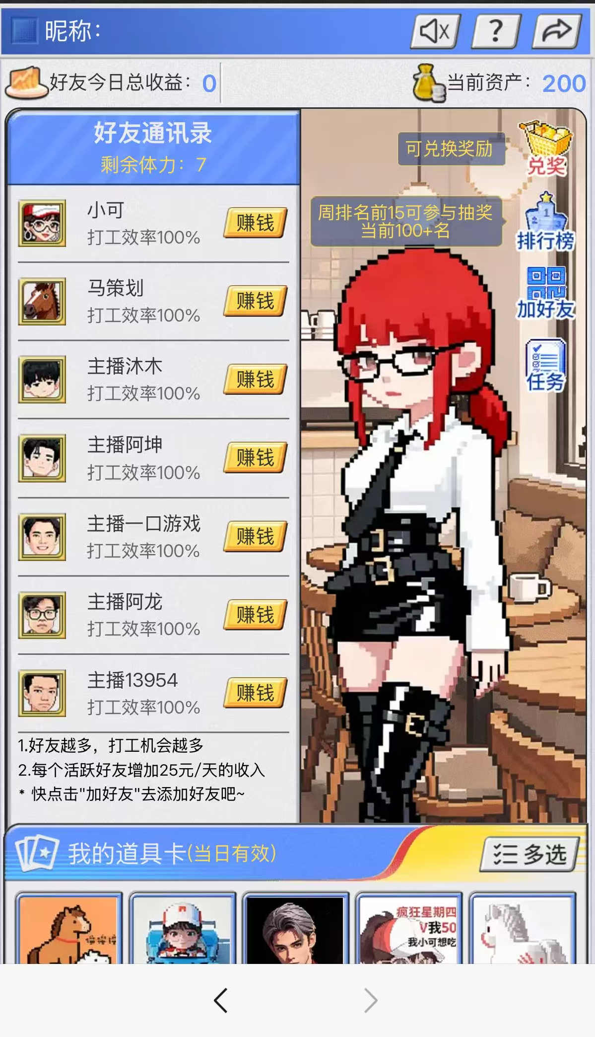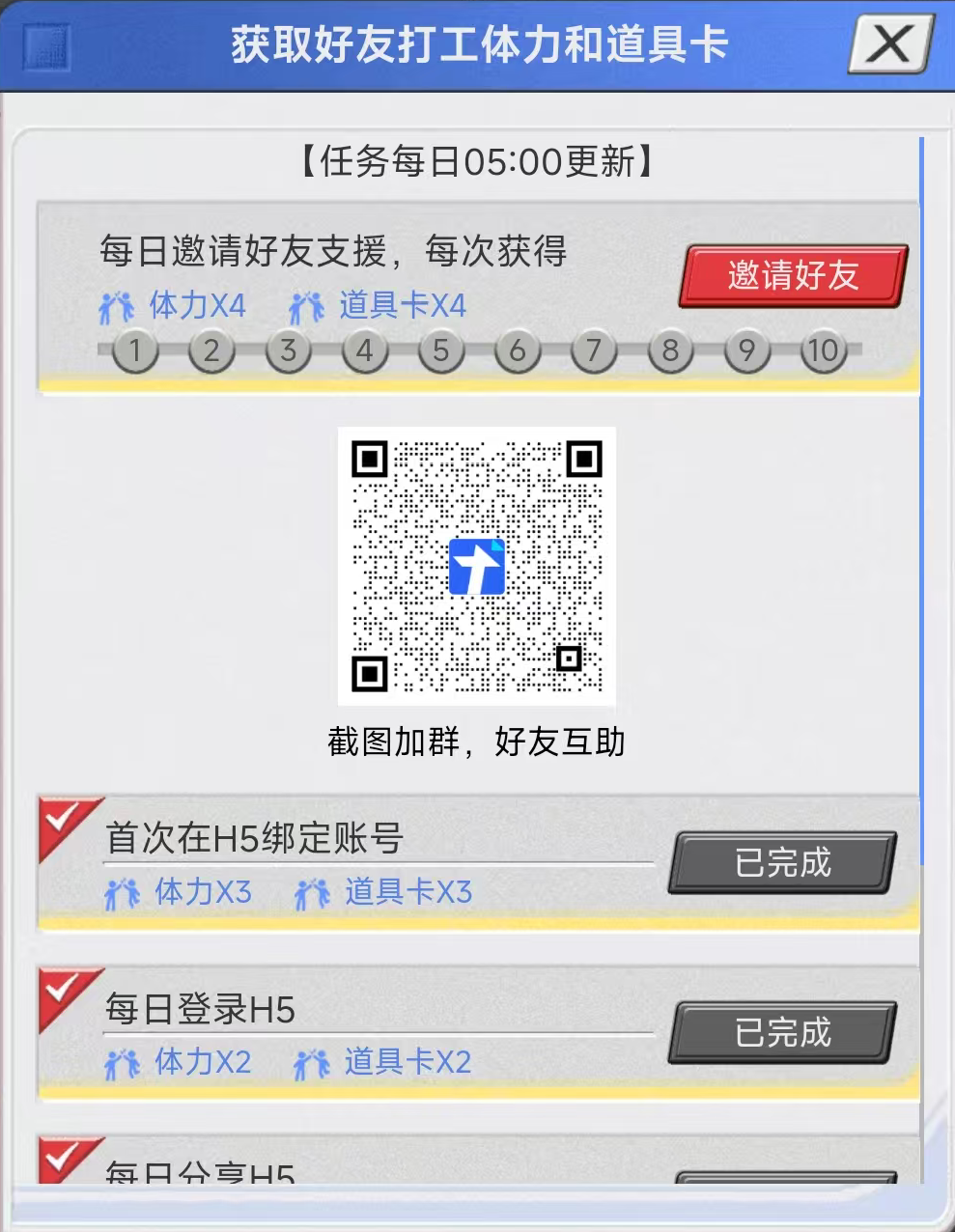体力、道具卡不够用?别慌😎!做任务就能一键补充,邀请好友支援、登录游戏分享H5等操作,都能让你快速回血~ 就算没好友也不怕!截图加入群聊,和各位老板互帮互助,搞钱之路更长远!