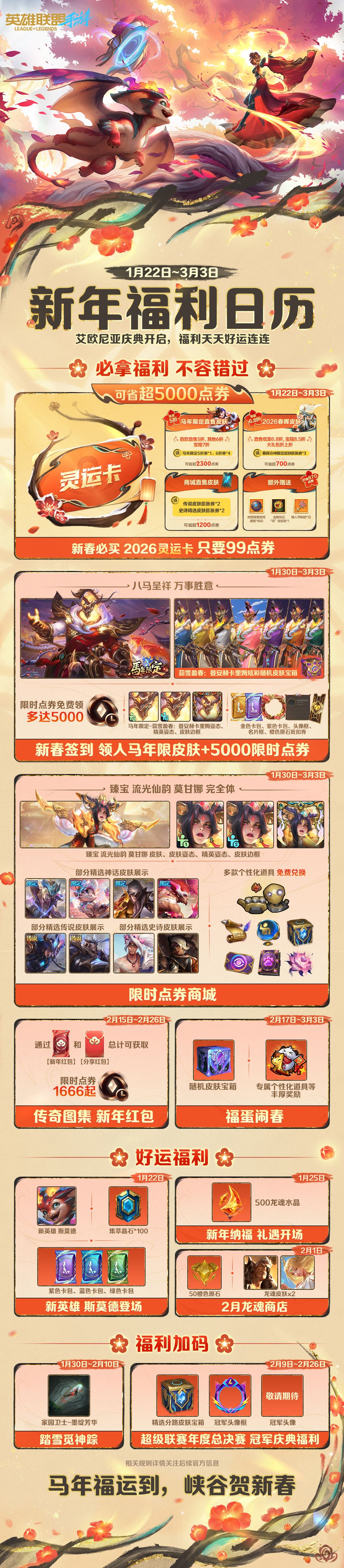 参与“新春签到”+“传奇图集新年红包”活动即可领6666限时点券!此外,召唤师完成“新年纳福 礼遇开场”分享任务共计可领取龙魂水晶*500好礼~(*由于鸿蒙系统暂未开放分享功能,因此无法参与本活动。)