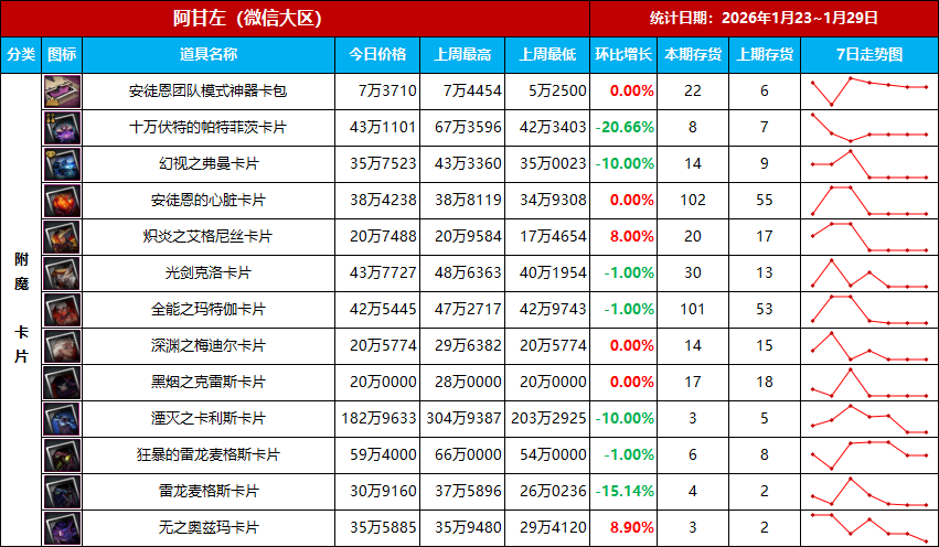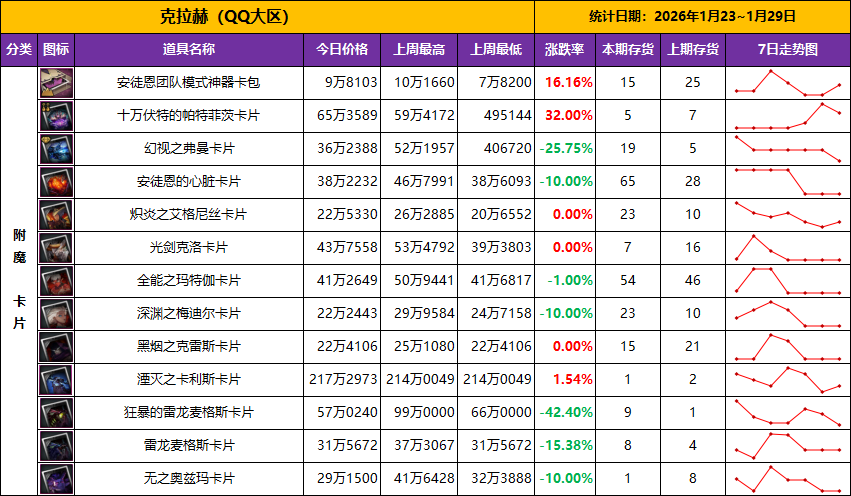 如果说微信区这种“人数较多”的区服,也卖不动附魔卡,更别说像QQ区这种地广人稀的区服了,没有贬低QQ区的意思,只是陈述事实,人多人少玩家自己最清楚,在人口不足的情况下,附魔卡更没有什么需求,即便有也是零散购买,加之定价普遍过高,对于不怎么追求细节和冲榜的更不会花重金去打造,加之近期整个市场环境预冷,不想入场的就别卖了,留着到2月份等机会吧。