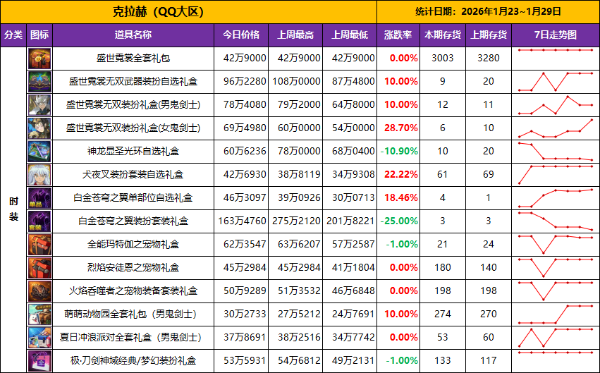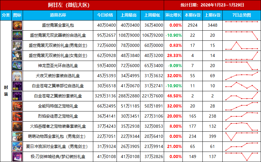 全套礼盒的受众还是挺多的,毕竟这个礼盒内容看上相当“实惠”,价格方面,40W泰拉也不是那种遥不可及的高度,攒一攒还是可以的,加之这一期时装整体表现还不错,能保持这样的长期需求挺不错的,至于其他礼盒,就没有全套礼盒那么吸引人了,要么价格太高,要么感觉不值或过气,预计未来一周走势会保持平稳,即便价格下跌也不会跌太多,随行就市。
